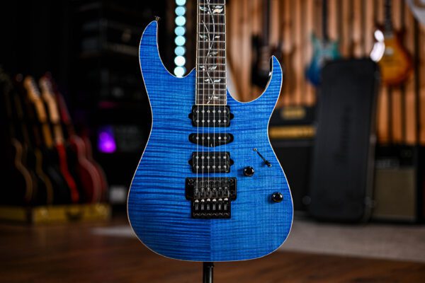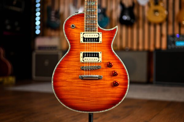 The Epiphone Alex Lifeson Les Paul Custom Axcess in Quilt Ruby is a fitting guitar for one of the most influential prog guitar players of all time. No need to Rush there is plenty to stop and admire on this Les Paul. If the carved maple top and flame maple veneer don’t draw you in, the rather uncommon sight of a tremolo on a Les Paul will certainly draw your attention. Indeed the more you look on this guitar the more details you find that this is a total performers guitar, what else could you expect from Alex Lifeson.