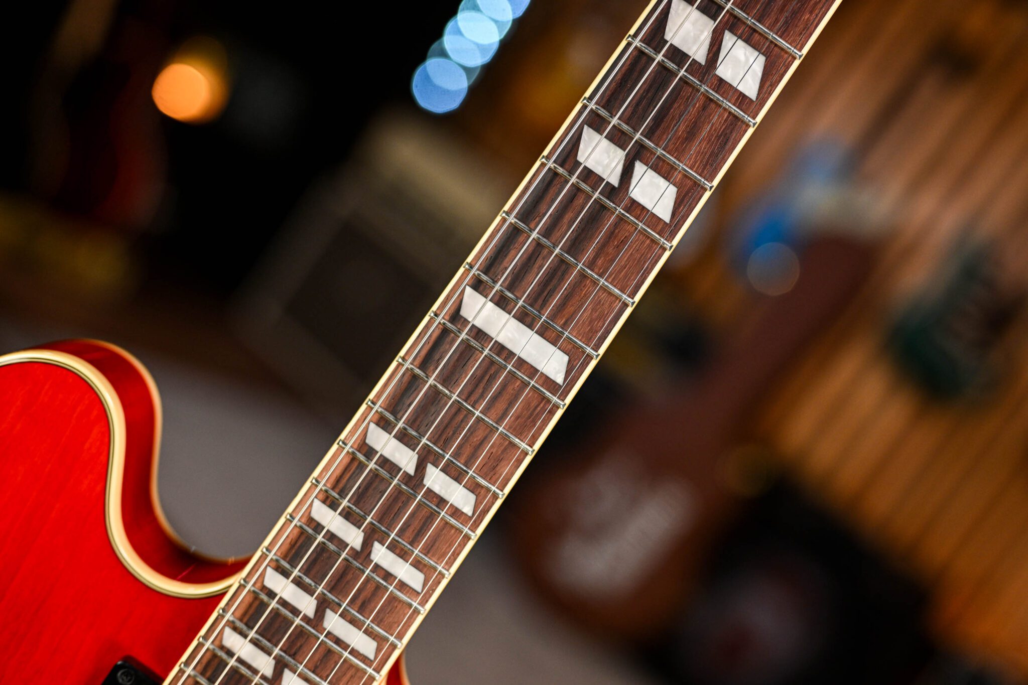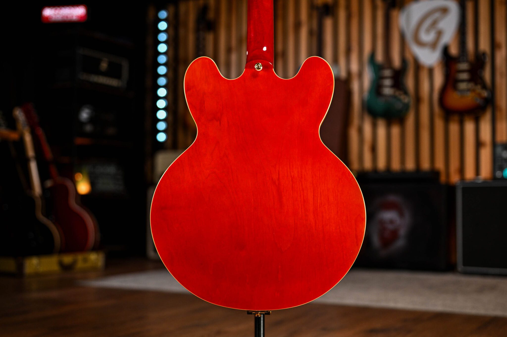 The Epiphone Back To The Future ES-345 features a traditional semi-hollow body crafted from 5-ply layered maple with a solid maple center block for improved sustain and reduced feedback. The period-correct Cherry Red finish looks super authentic, the Epiphone team have done a great job at colouring this guitar with the iconic Gibson used in the film. The top is finished with four-ply binding, while the back sports single-ply binding.
