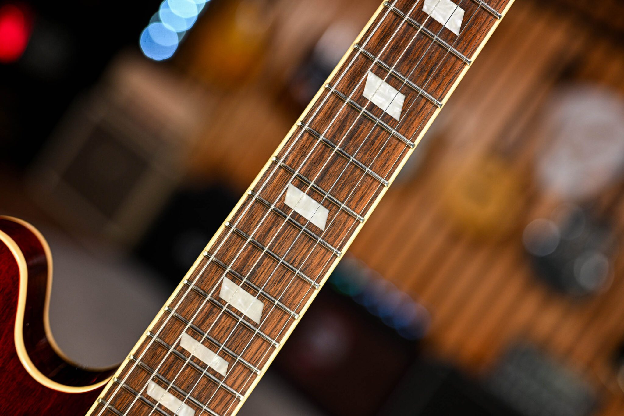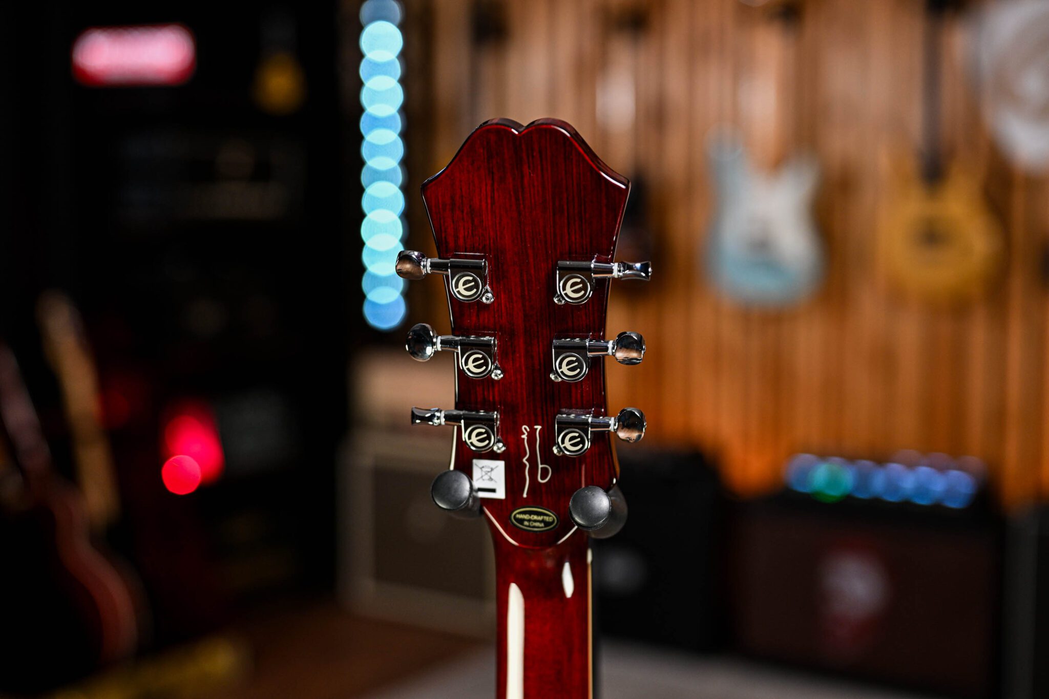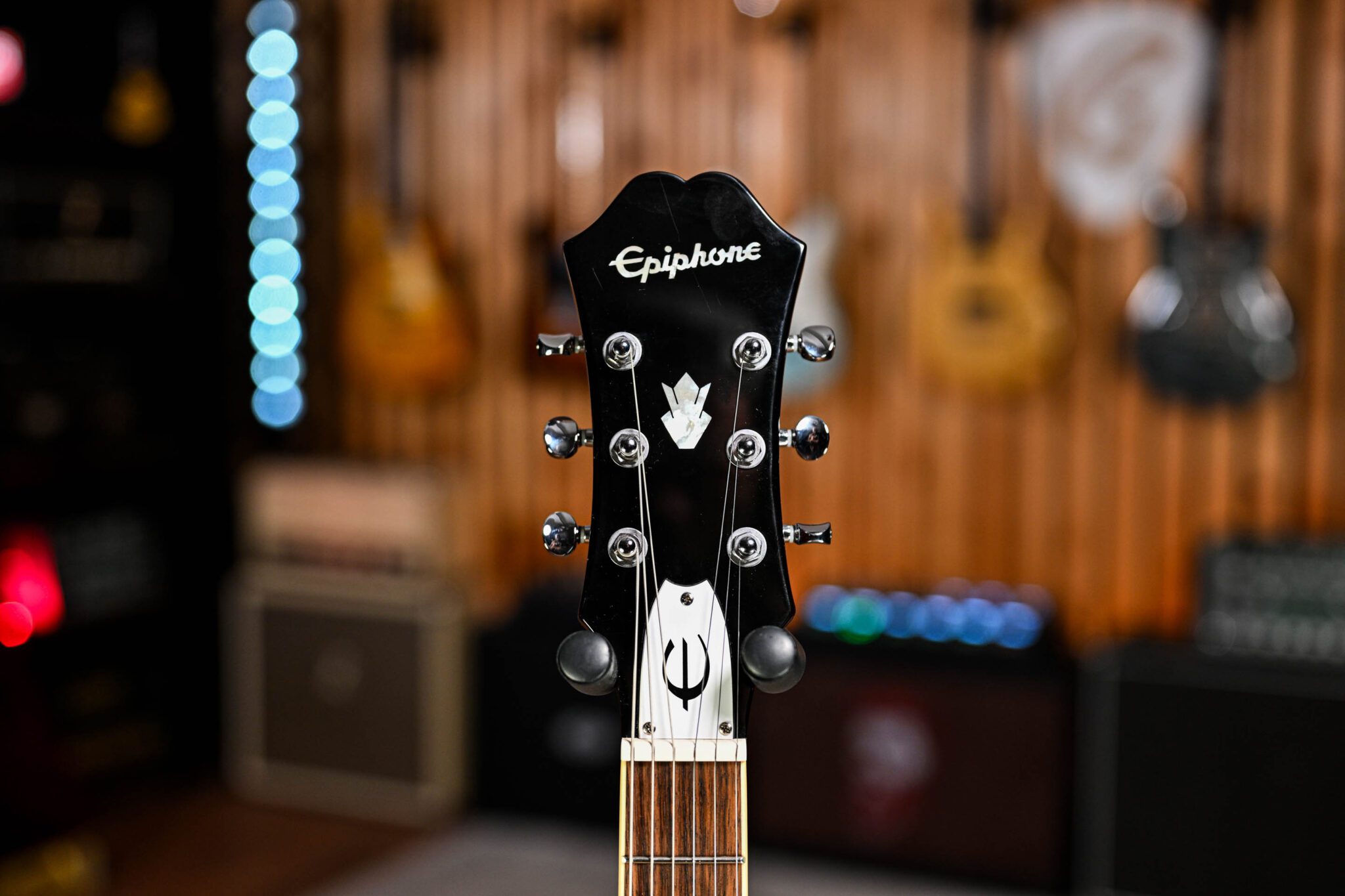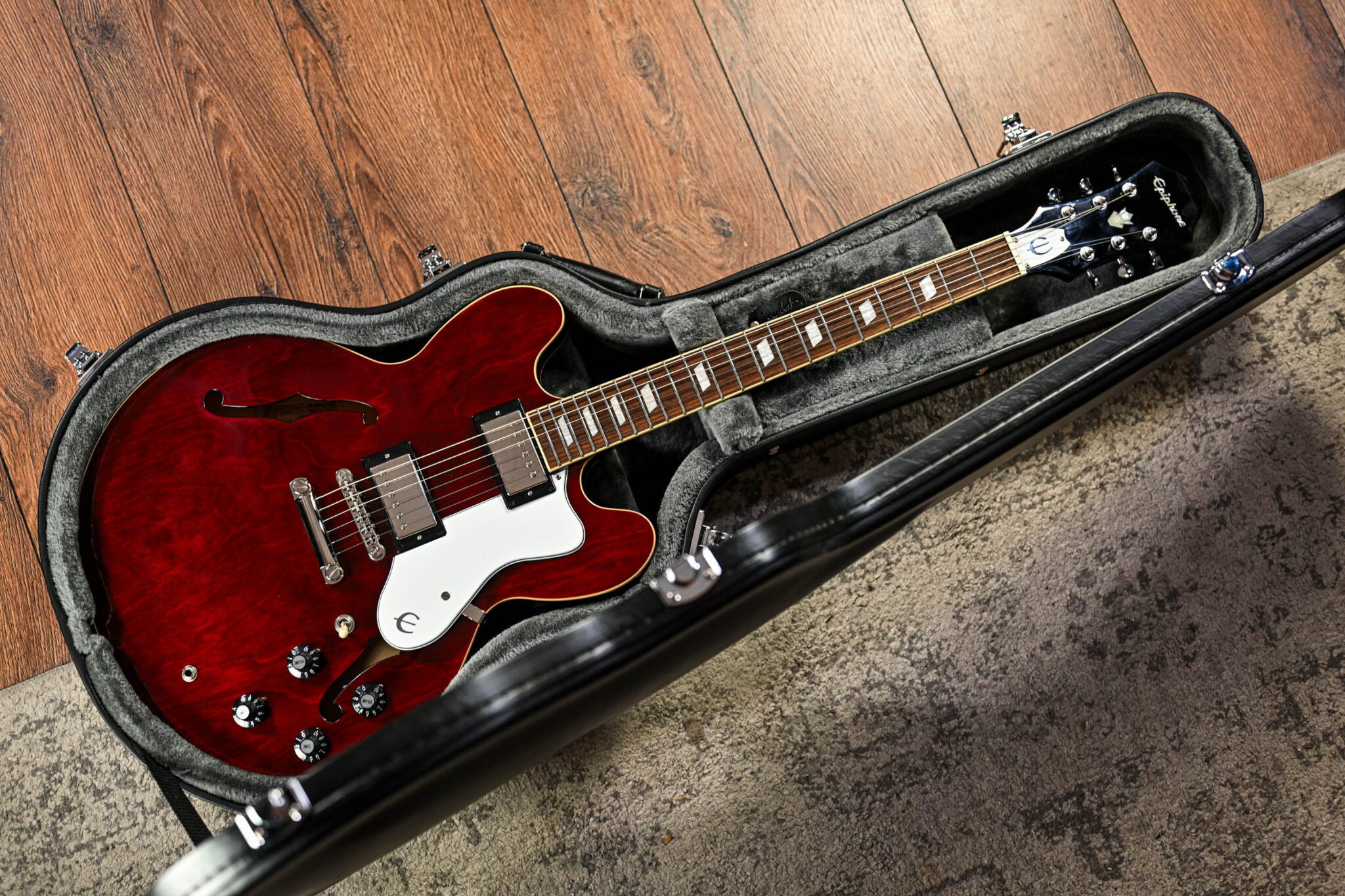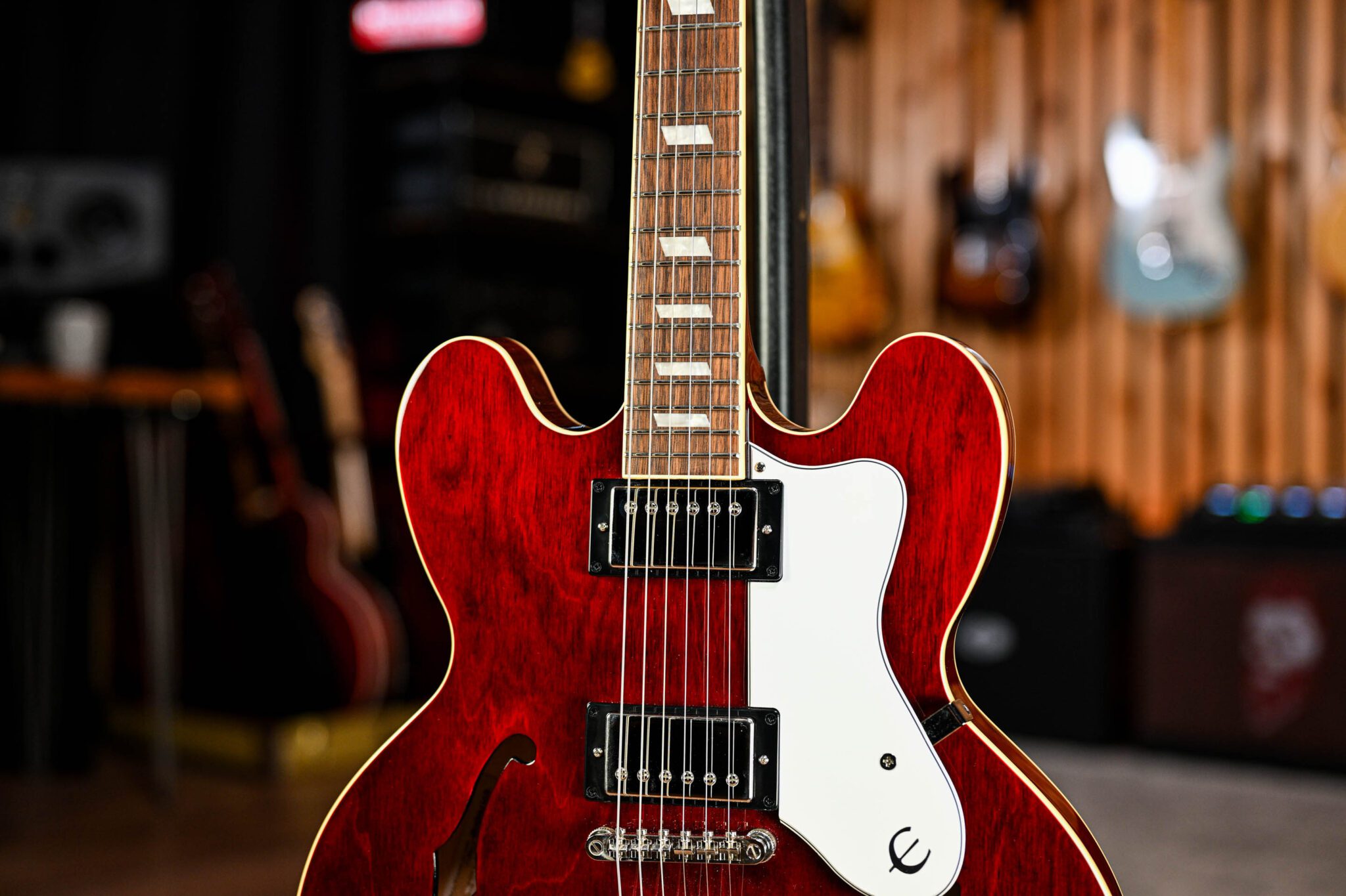 This Epiphone Noel Gallagher Riviera is a real classic looking guitar and is designed to be as accurate as possible to the original used in the early Oasis touring days. Epiphone were granted access to the original guitar to make sure they got all the details spot on and this Rivera has certainly come out a looker. The deep wine red and vintage appointments give this guitar timeless look and combined with the modern reliable hardware it makes for a real workhorse player.
