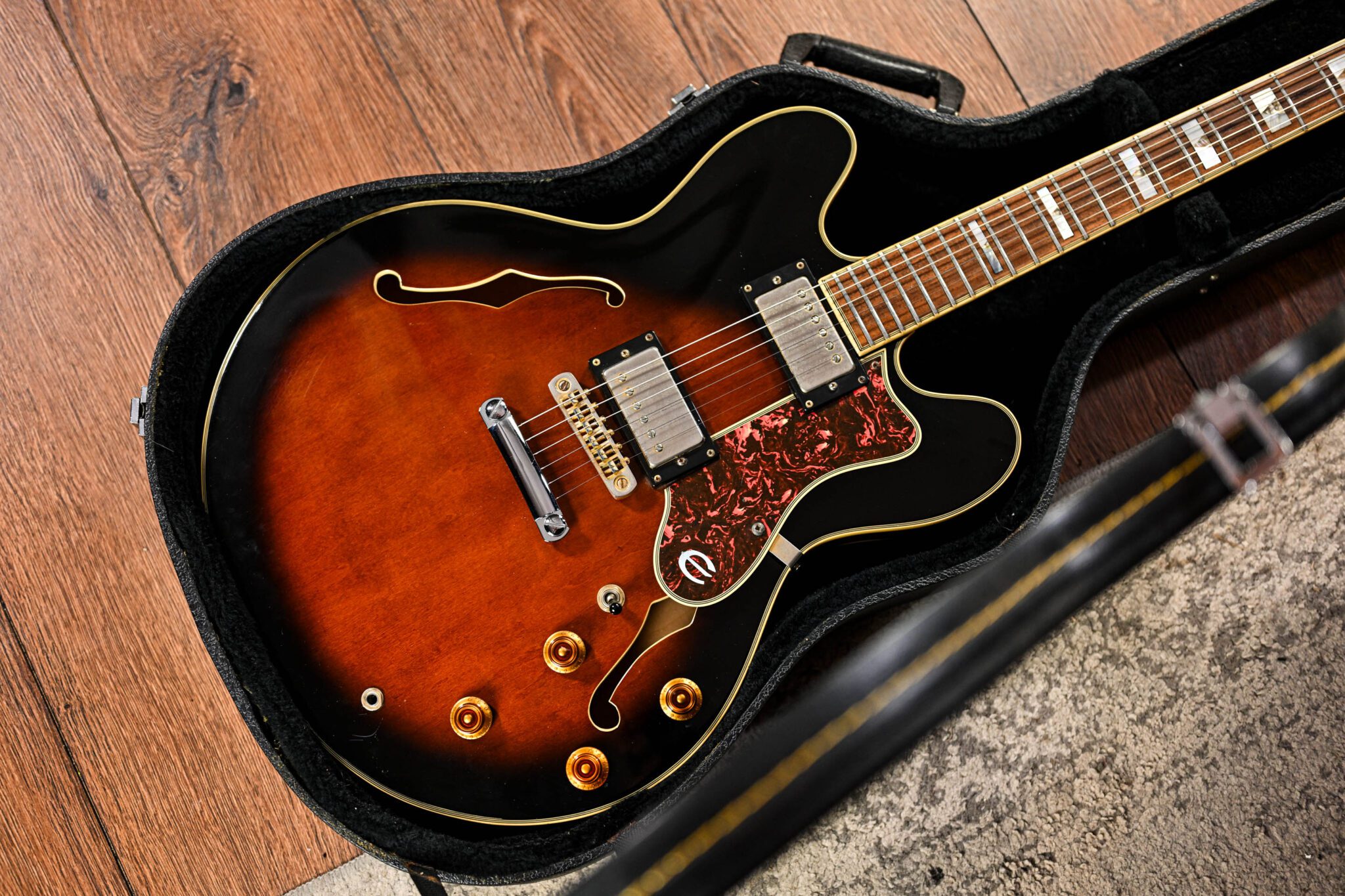 Originally released by Epiphone in 1959 as their high quality thinline semi acoustic alternative to the Gibson ES335/345, this guitar has always been a go to for those looking for a slight tweak and individuality to the classic design. This was the top-of-the-line instrument and if you know your Epiphone history, you know how good this model is and how well they perform! Finished in a stunning vintage sunburst with gold hardware and abalone fret markers, this guitar sounds and plays every bit as good as she looks.