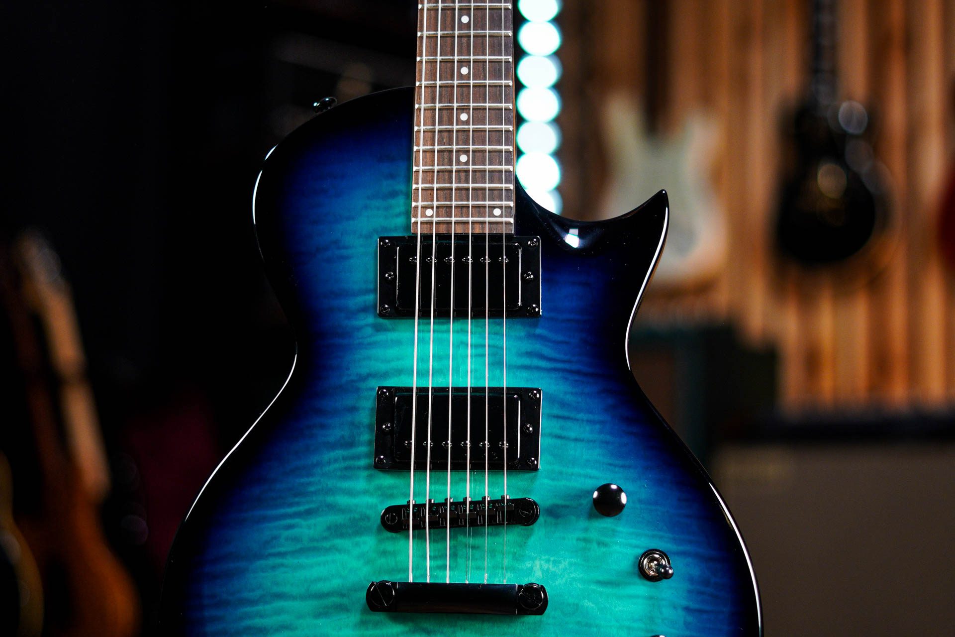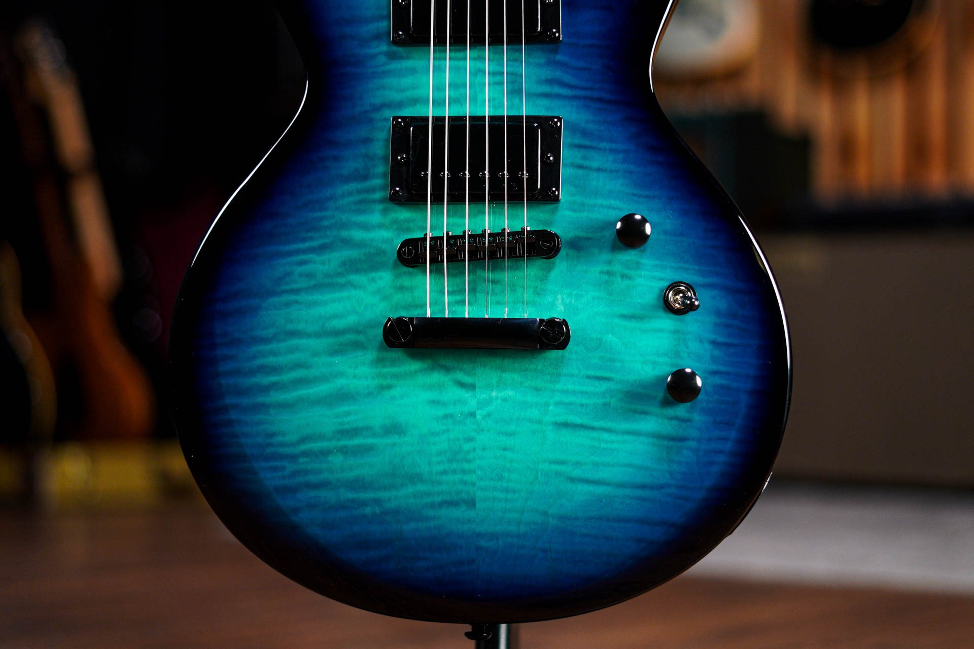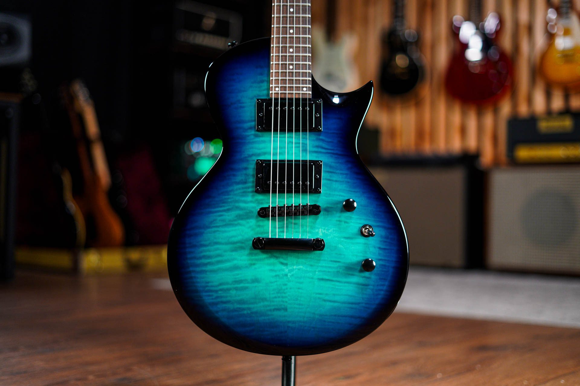 The EC-200DX features a flat-top single-cutaway Eclipse body with a beveled edge, providing both comfort and style. Built with bolt-on construction, this guitar has a 24.75” scale length, a poplar body with a stunning flamed maple top, and a roasted maple neck with a rosewood fingerboard, ensuring smooth playability and rich tones.