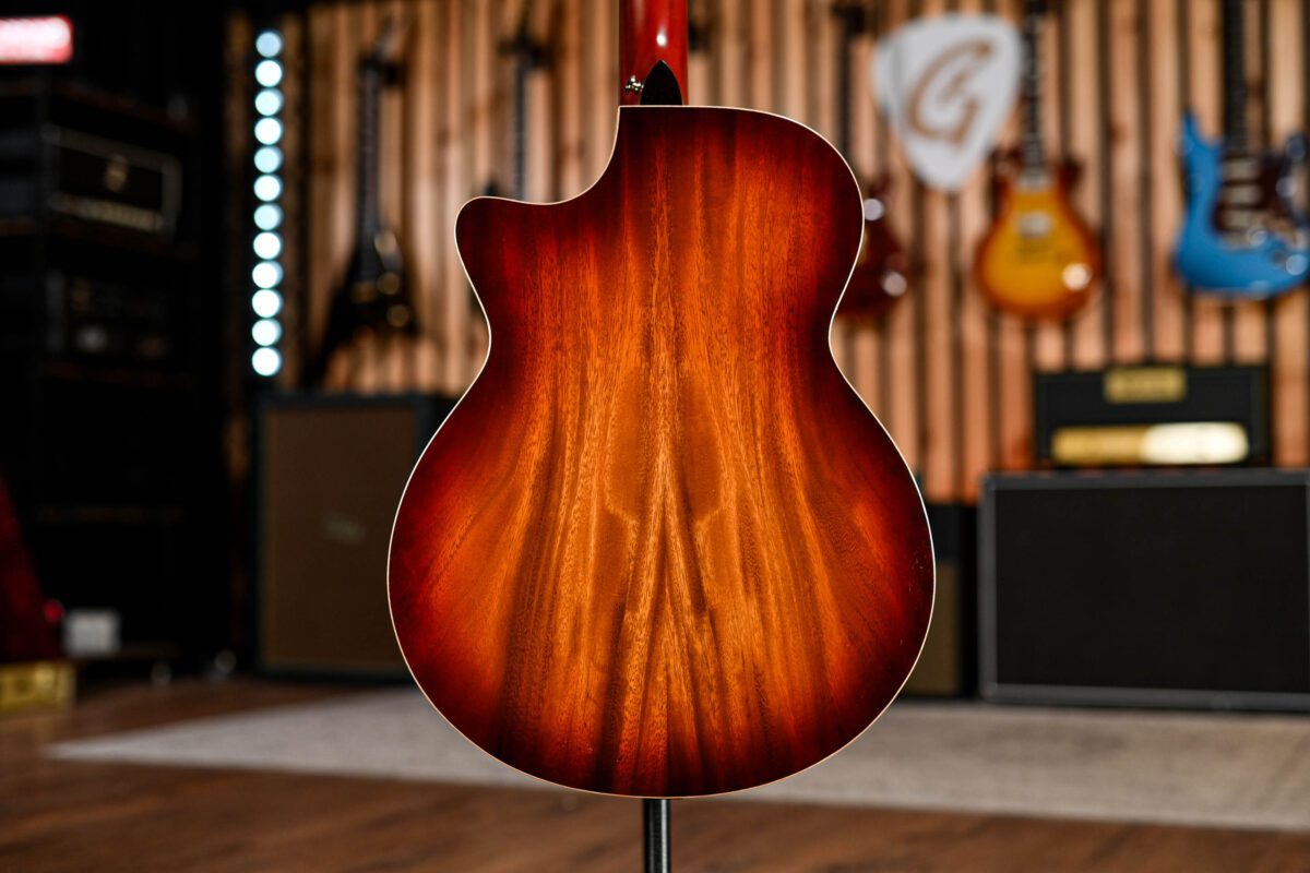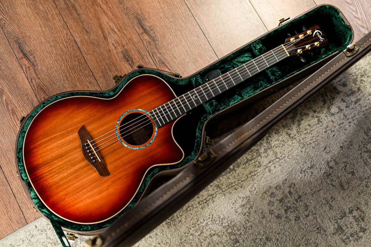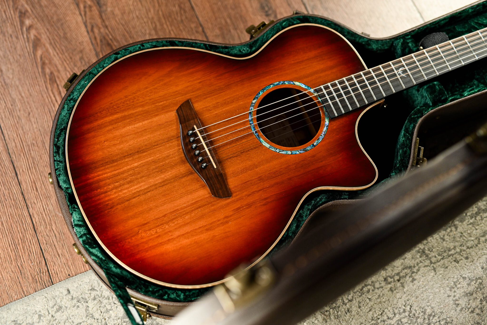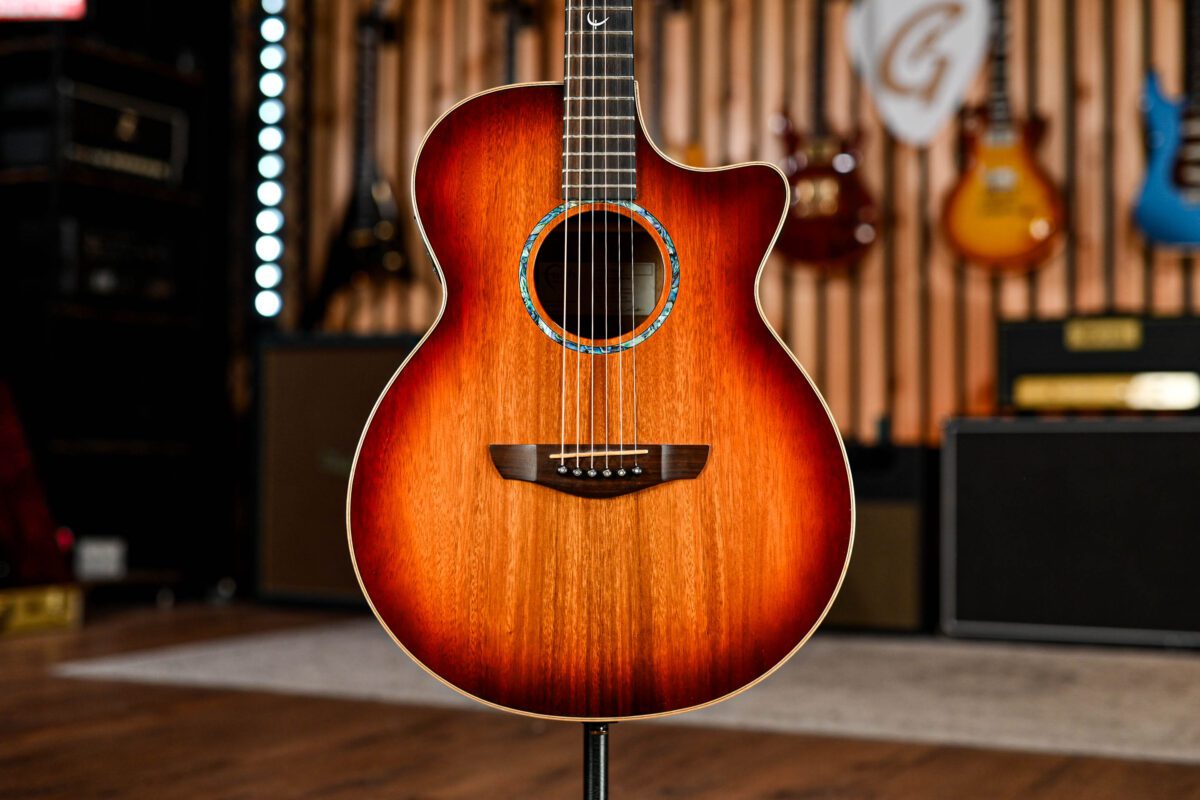 The Faith Venus Blood Moon is a visually stunning and tonally rich electro-acoustic guitar that blends world-class craftsmanship with dramatic beauty. Featuring a solid figured trembesi top, back, and sides. The guitar delivers a balanced, powerful voice, that shines through whether fingerpicked or strummed.