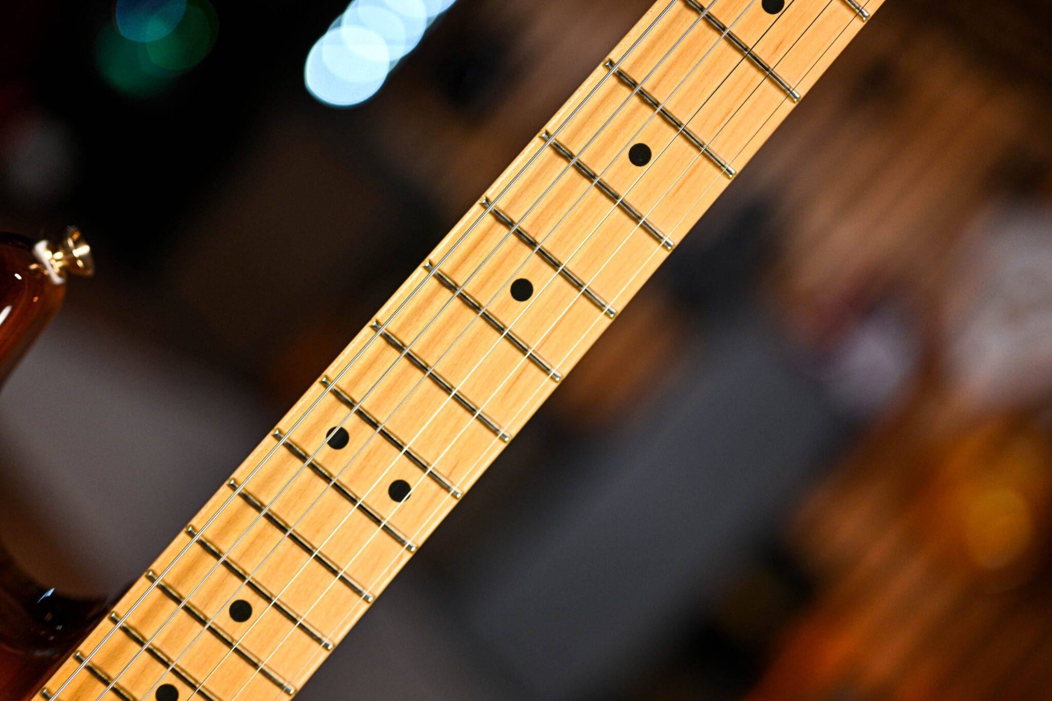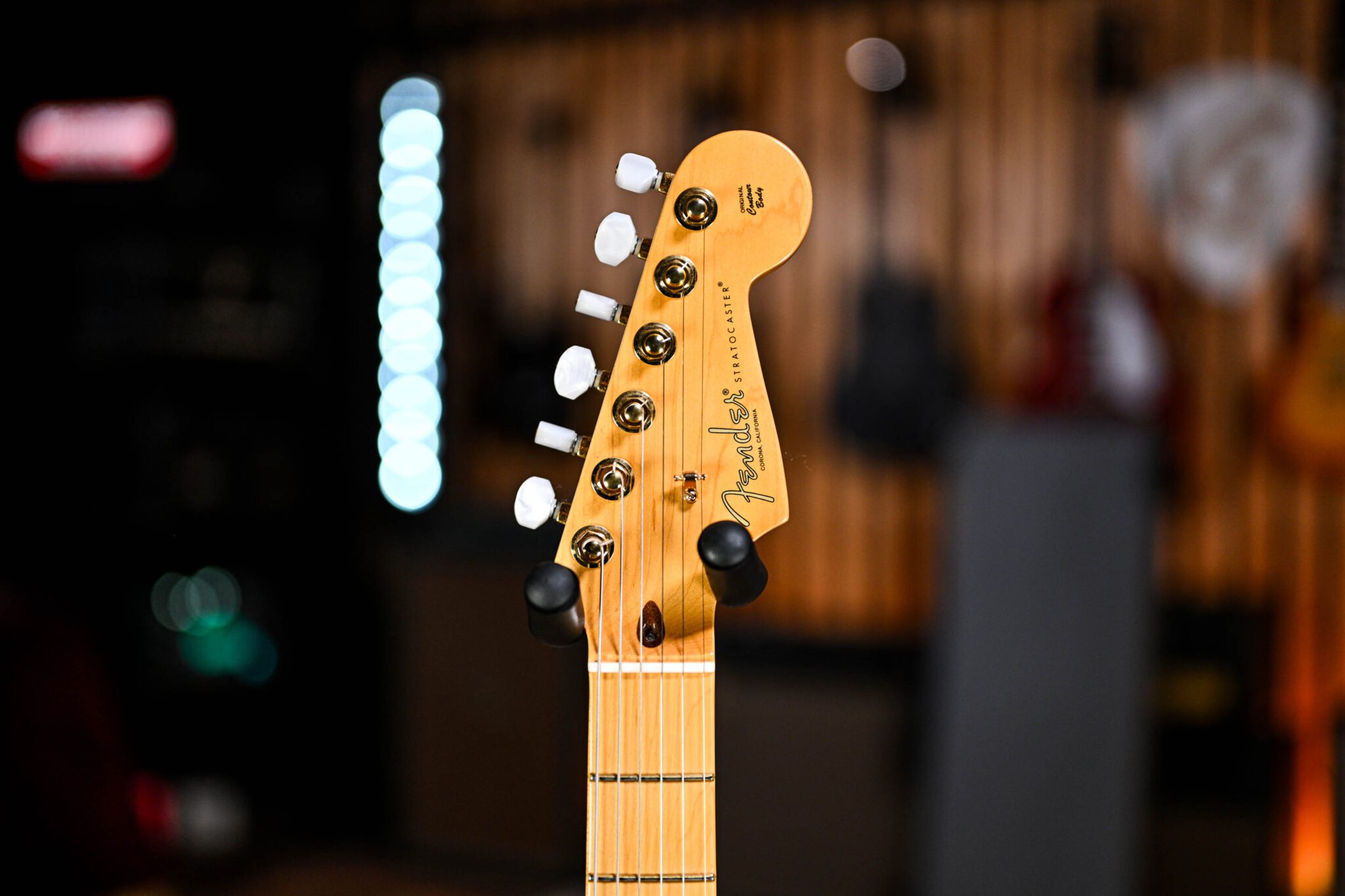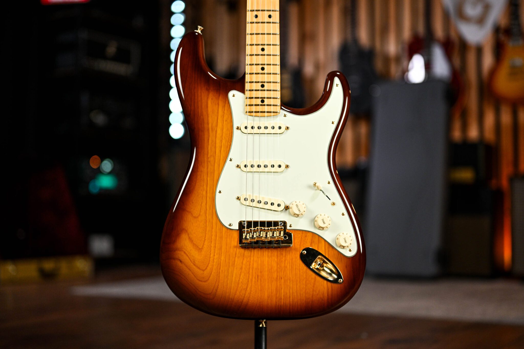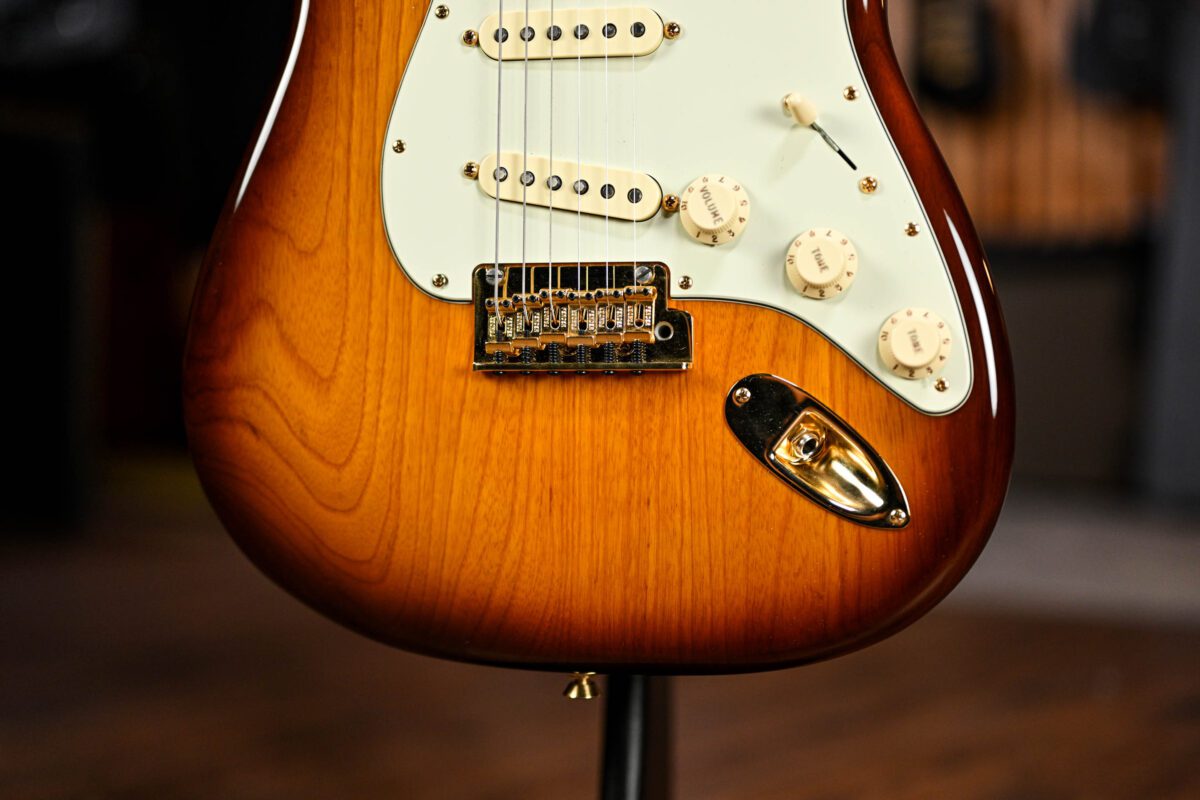 Decked out in a beautiful 2-Color Bourbon Burst finish over an ash body, with gold hardware and pearl button locking tuners. The one-piece maple neck features a Deep “C” profile, rolled fingerboard edges, a “Super-Natural” satin finish and a sculpted neck heel for unsurpassed comfort and playability. Custom Shop Fat ‘60s pickups provide sweet Strat tone with added low-end punch while a 2-point tremolo with cold-rolled steel block enhances sparkle, sustain and tuning stability. Finally, each Commemorative Stratocaster features a 75th anniversary ingot inlaid into the back of the headstock and an engraved anniversary neck plate reminding you that you are playing something very special every time you play the guitar.