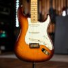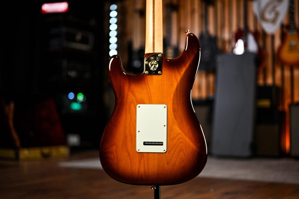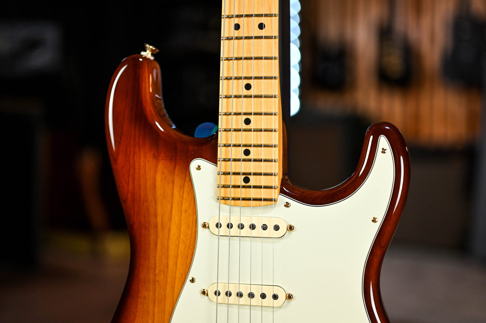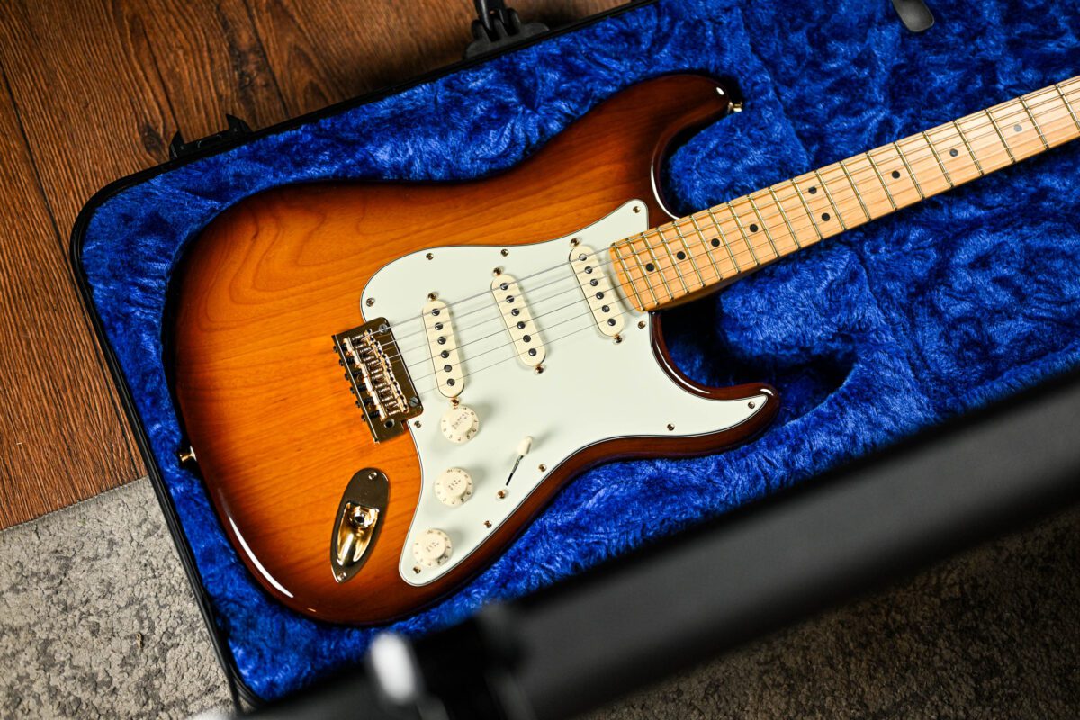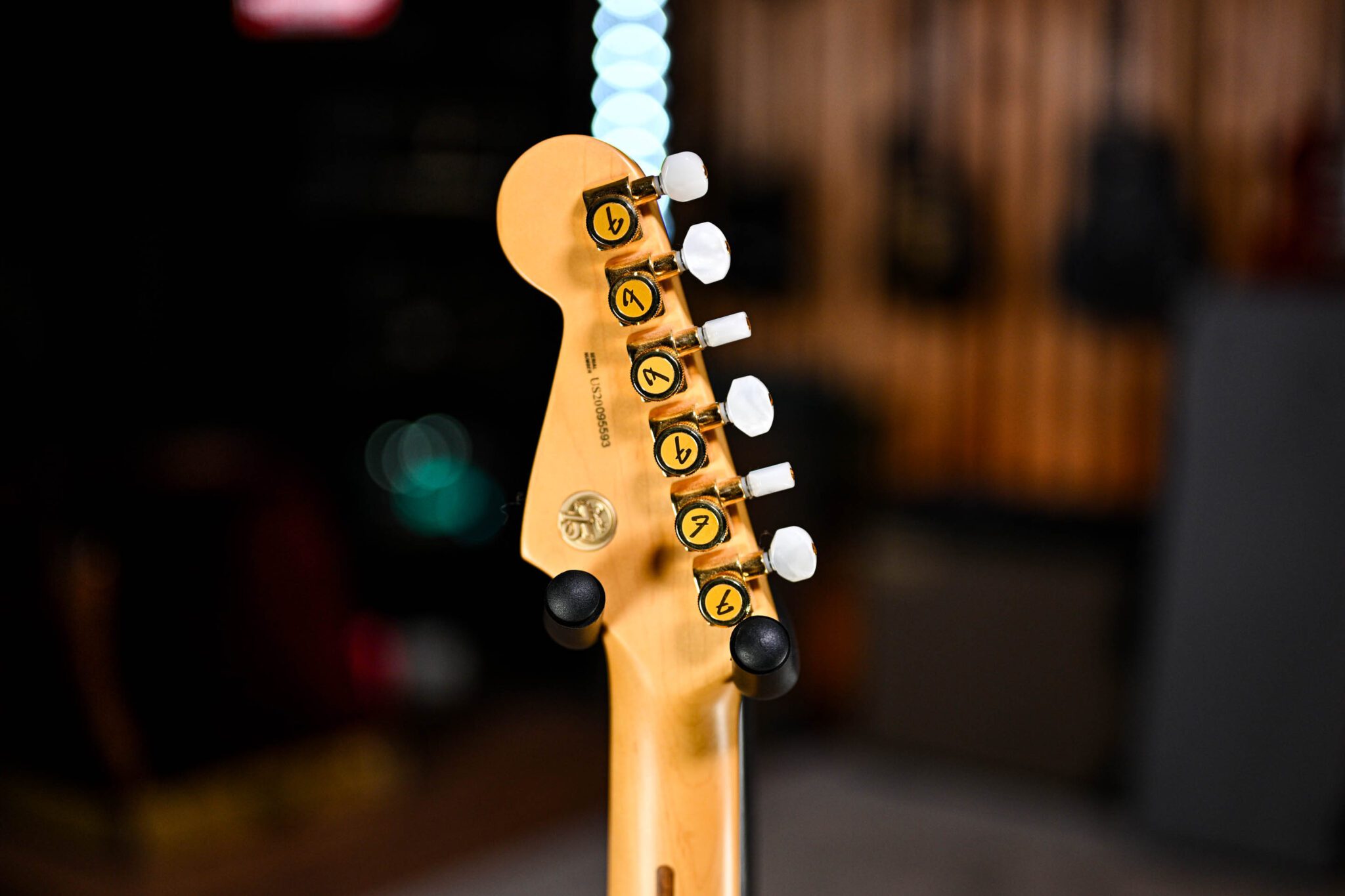 Decked out in a beautiful 2-Color Bourbon Burst finish over an ash body, with gold hardware and pearl button locking tuners. The one-piece maple neck features a Deep “C” profile, rolled fingerboard edges, a “Super-Natural” satin finish and a sculpted neck heel for unsurpassed comfort and playability. Custom Shop Fat ‘60s pickups provide sweet Strat tone with added low-end punch while a 2-point tremolo with cold-rolled steel block enhances sparkle, sustain and tuning stability. Finally, each Commemorative Stratocaster features a 75th anniversary ingot inlaid into the back of the headstock and an engraved anniversary neck plate reminding you that you are playing something very special every time you play the guitar.