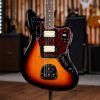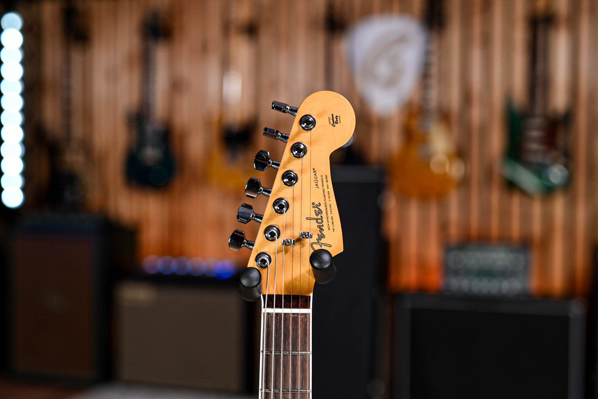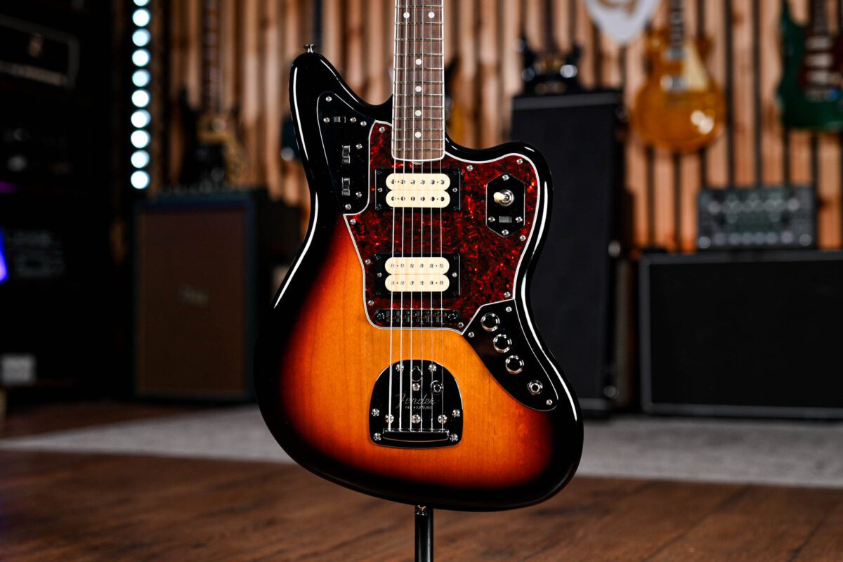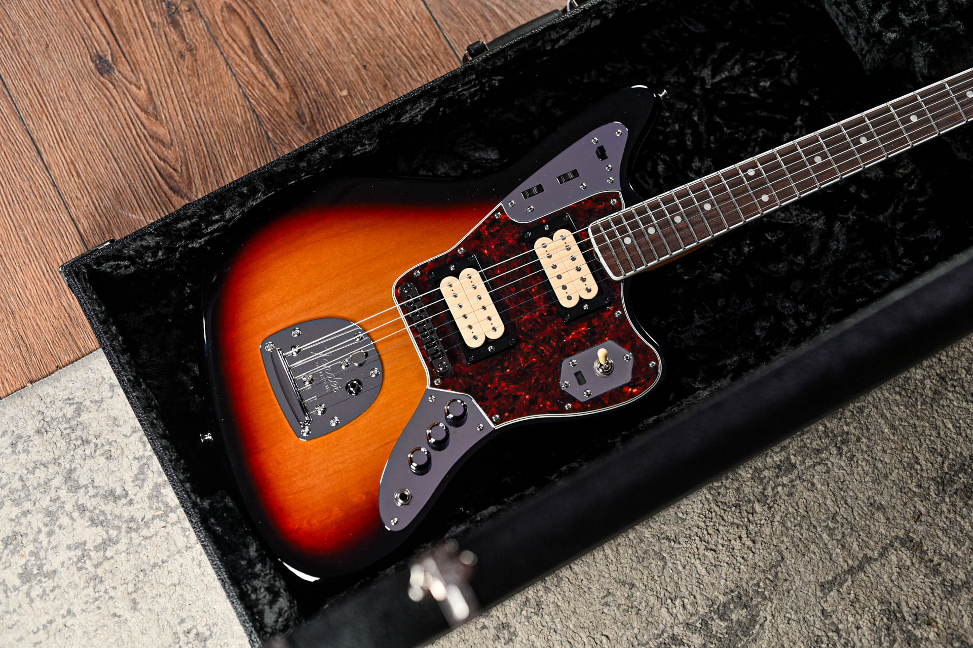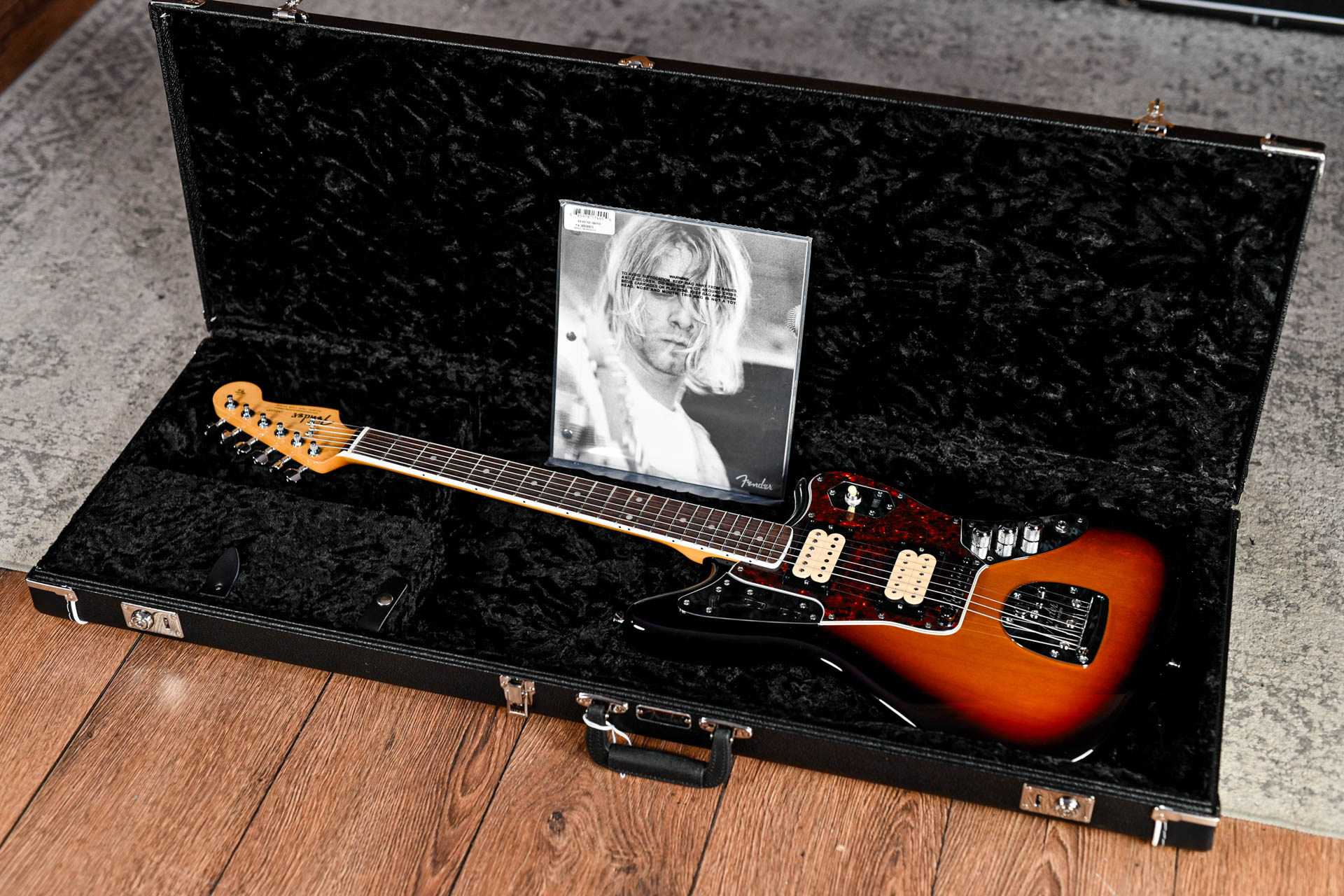 With dual humbucking pickups and unique electronics found on the Jaguar Kurt attained in the summer of 1991, this really is a throw-back and a testament to that unique tone and sound. This iconic guitar is packed with special features including DiMarzio DP103 PAF 36th Anniversary neck and DP100 Super Distortion pickups providing Kurt’s unique tone, while a triple knurled “chrome-dome” knob configuration (volume-volume-tone), three-position toggle switch, and black chrome Adjusto-Matic bridge complete the composition.