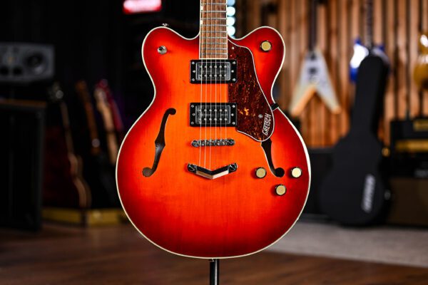 Features include an alder body, bound fingerboard with pearloid dot markers, Stratocaster headstock shape with 1950s-style “spaghetti” logo, DiMarzio pickups, triple knurled “chrome-dome” knob configuration (volume, volume, tone), three-position toggle switch, black chrome Adjusto-Matic bridge and Gotoh sealed tuners. This all comes together to produce a super unique and versatile guitar that takes us straight back to the early 90s Grunge scene!