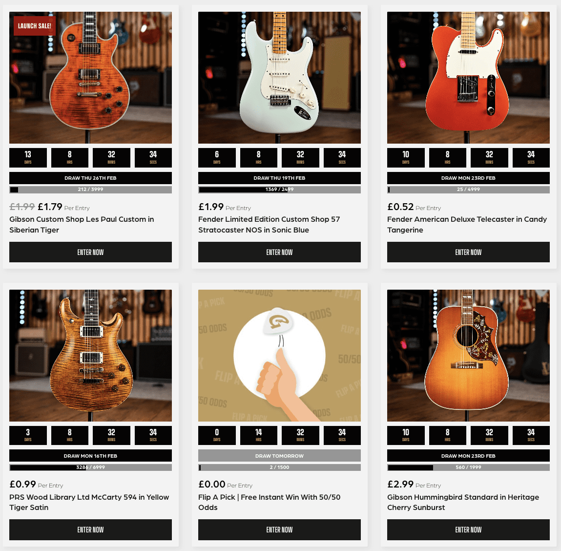 Most of what we do is pre-loved, but there are also a number of guitars on the site that are new (Instant Win competitions, for example). We always state in the prize description whether a guitar is new or pre-loved, and in most cases, we also add the year and a condition description.