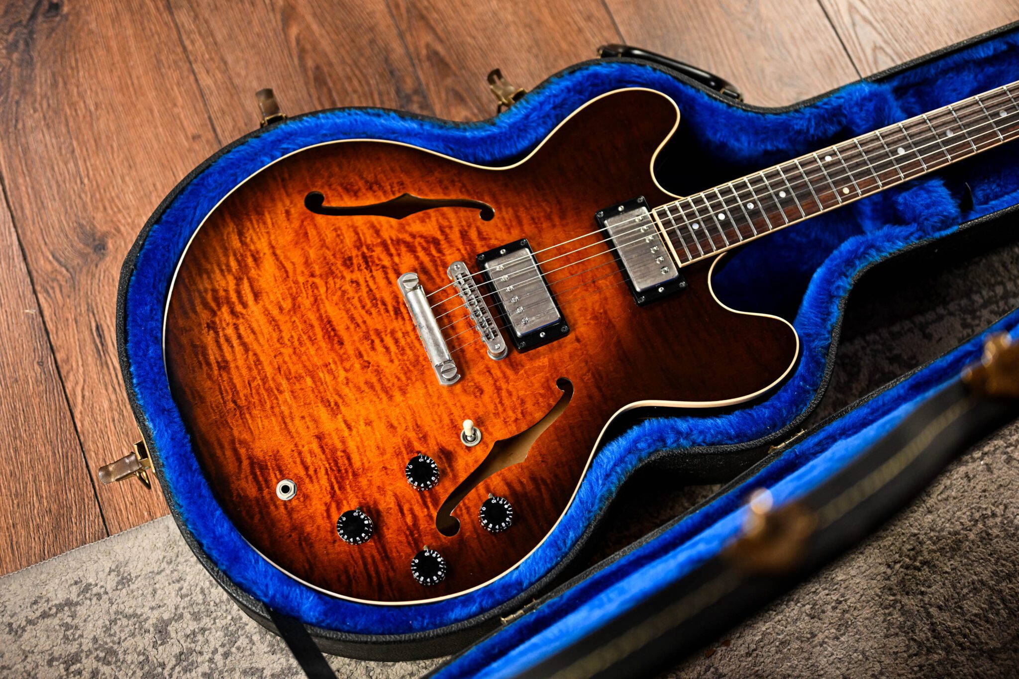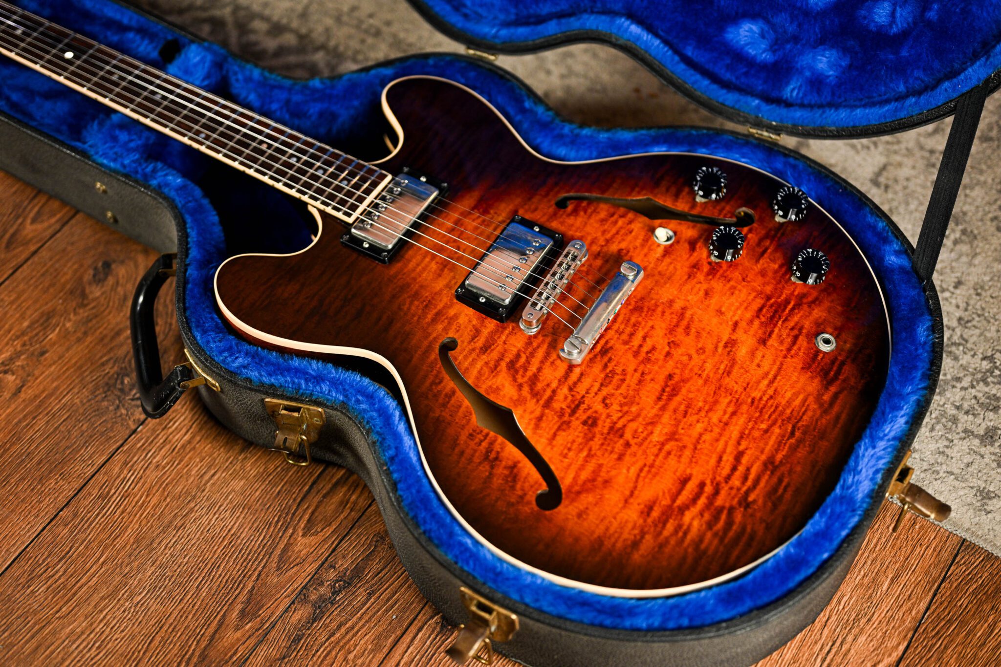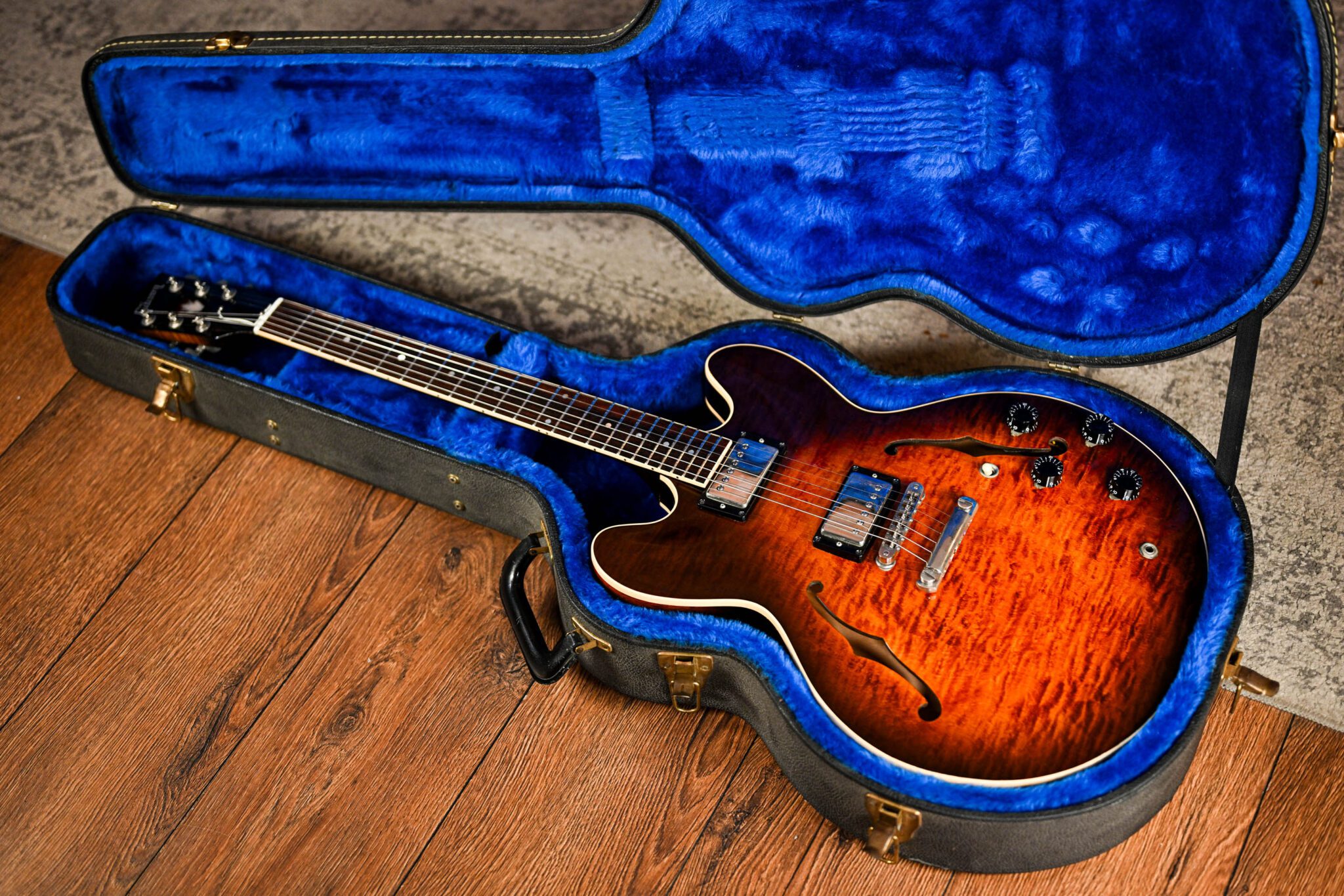 All the most loved classic ES-335 features are present; maple, popular, maple top and back with a solid maple centre block and of cause semi hollow construction and a figured top and back beautifully crafted into one totally stunning instrument. First produced by Gibson in 1958, the classic formula thankfully hasn’t changed, and this highly figured 1987 model is a truly stunning example! From rock to blues and everything in-between there isn’t much this guitar can’t handle with ability to combine amazing clarity, midrange and huge sustain all at the same time.