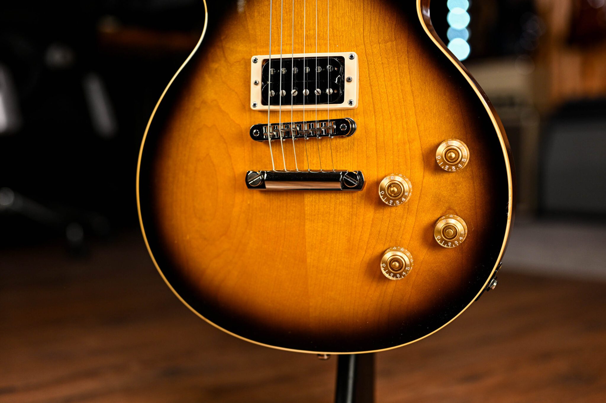 This 1996 Les Paul Standard was built at a time many consider a golden era for Gibson manufacturing. It’s certainly a stellar example of Gibson and an all-round wonderful electric guitar. Its Tobacco Burst body shows of the classic Les Paul contours and curves in contrast with the white/cream binding and it looks totally stunning! With excellent materials and build the guitar has a bright punchy tone with singing sustain and all the wonderful Les Paul grunt and we absolutely love it!