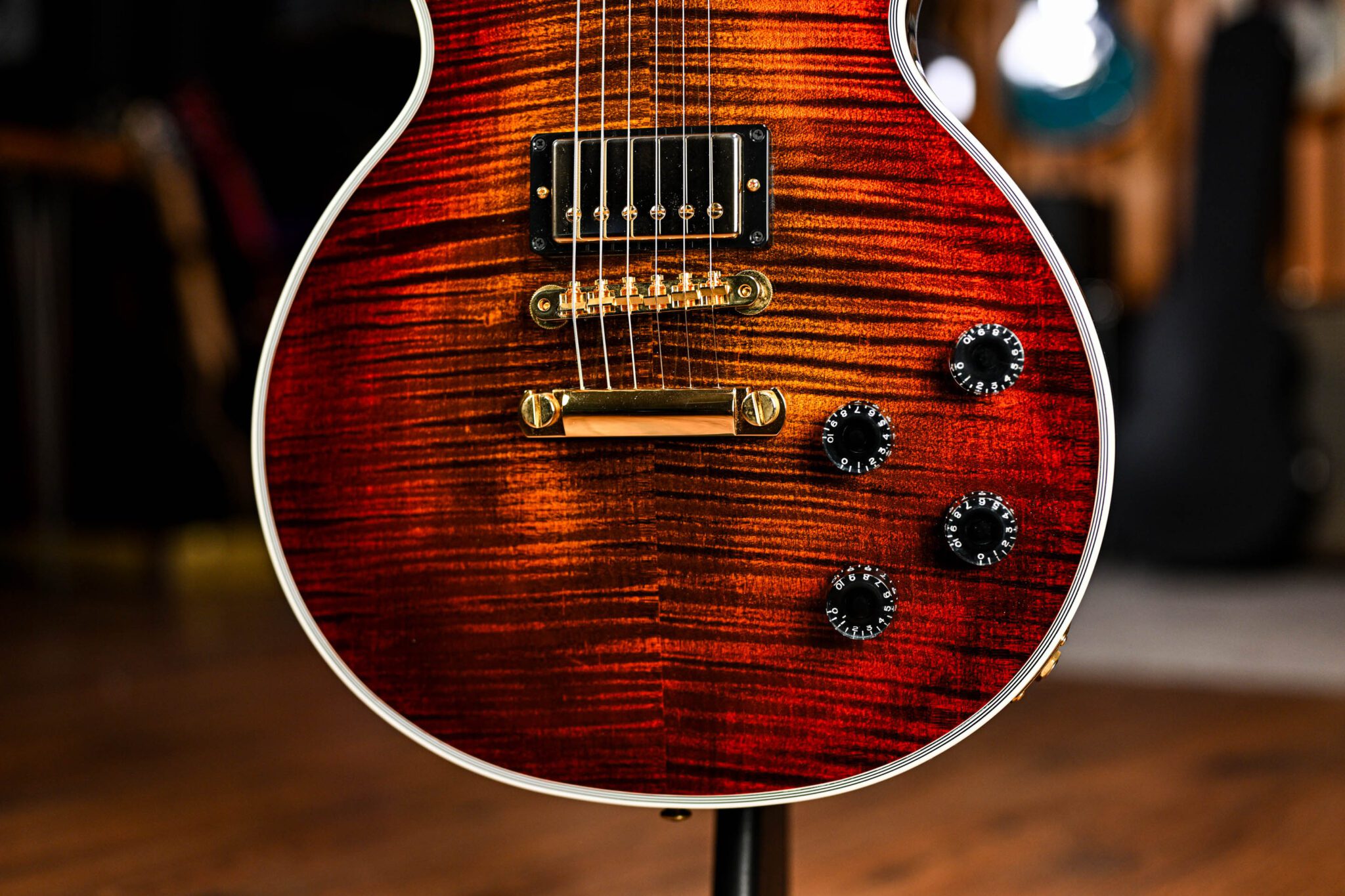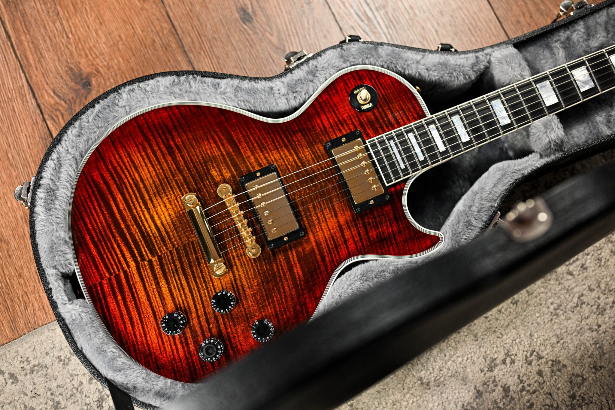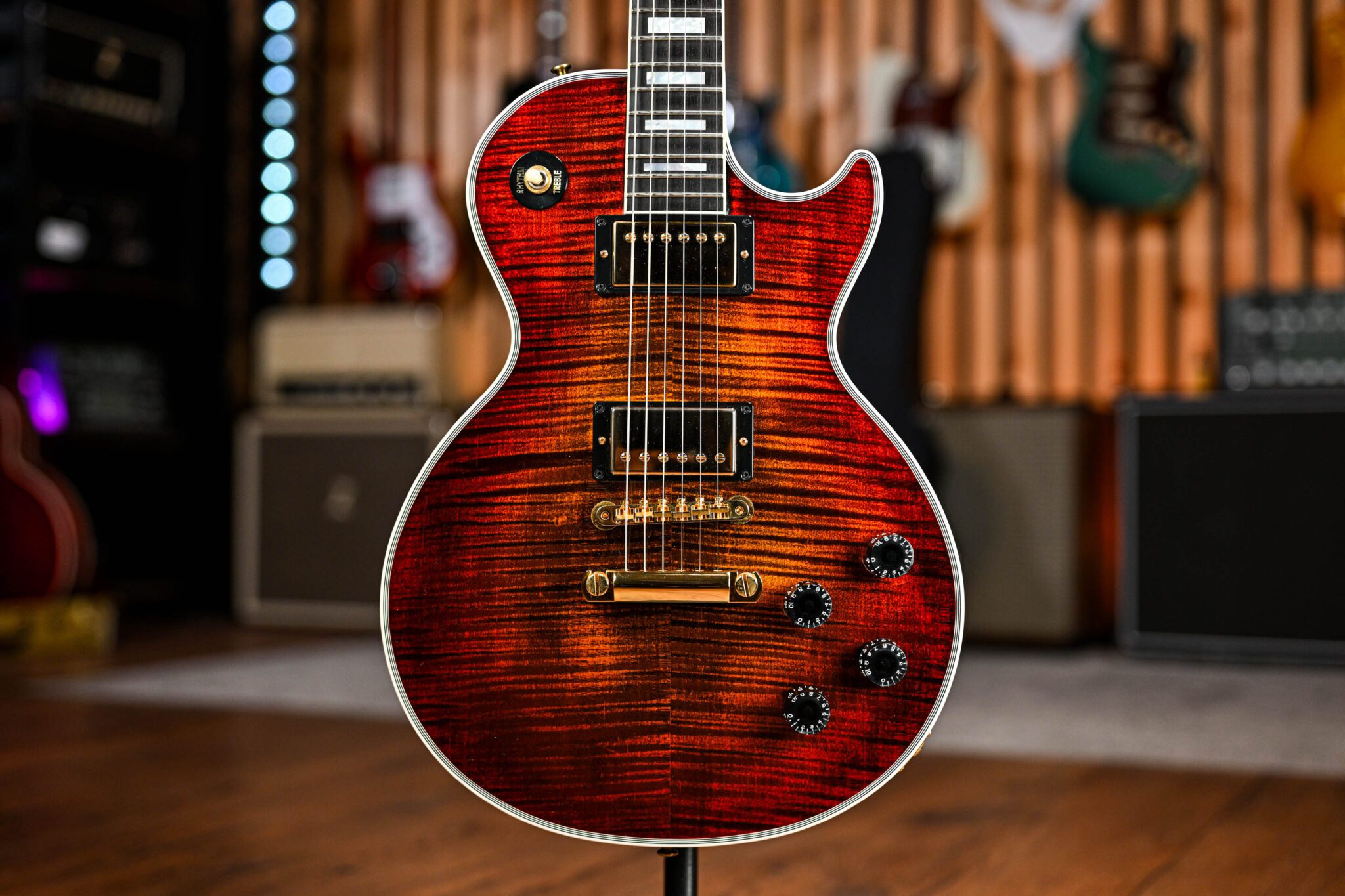 The ultimate players Les Paul, topped off with a stunning flame maple cap and finished in the wild Bengal Burst. This Les Paul is in a league of its own!