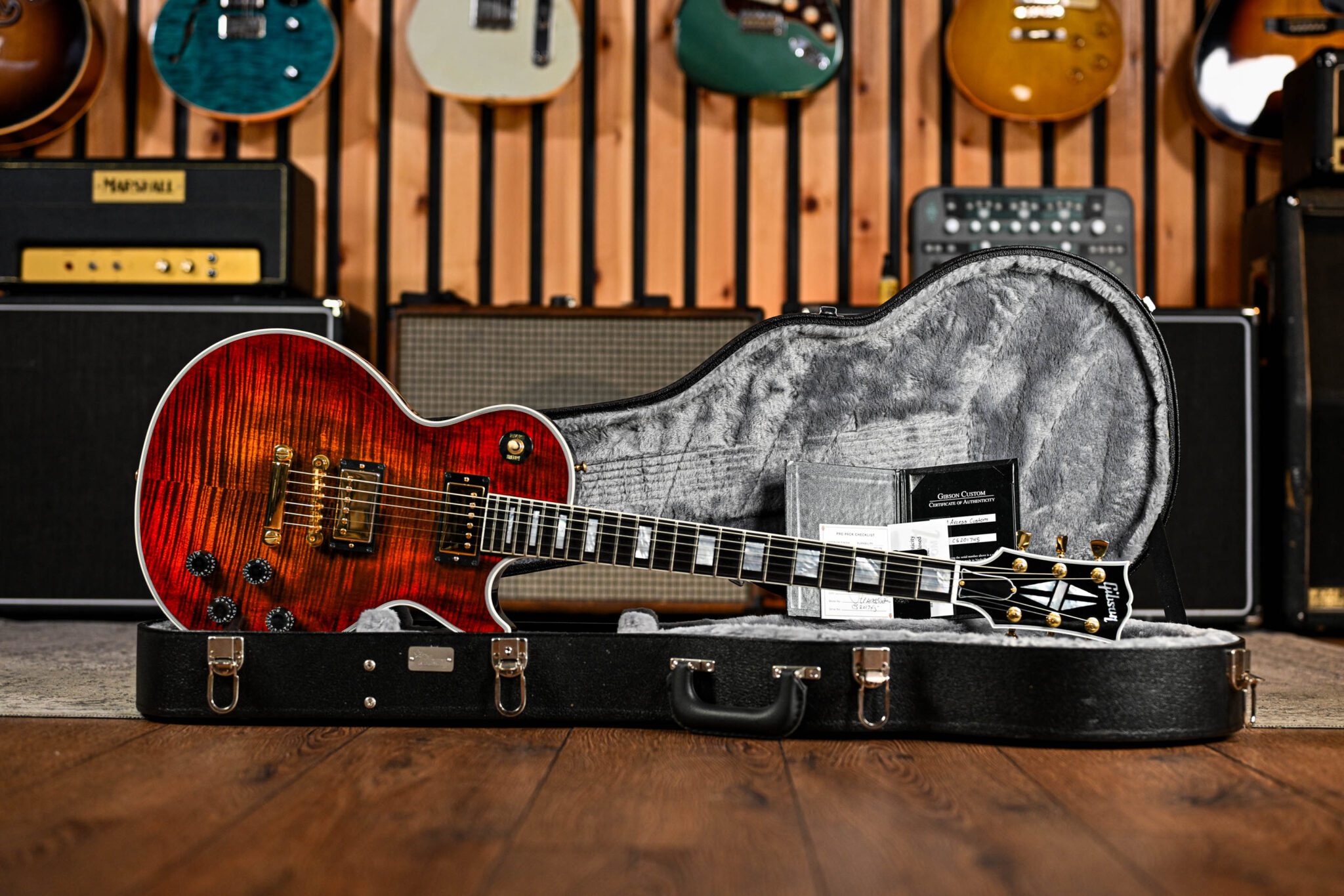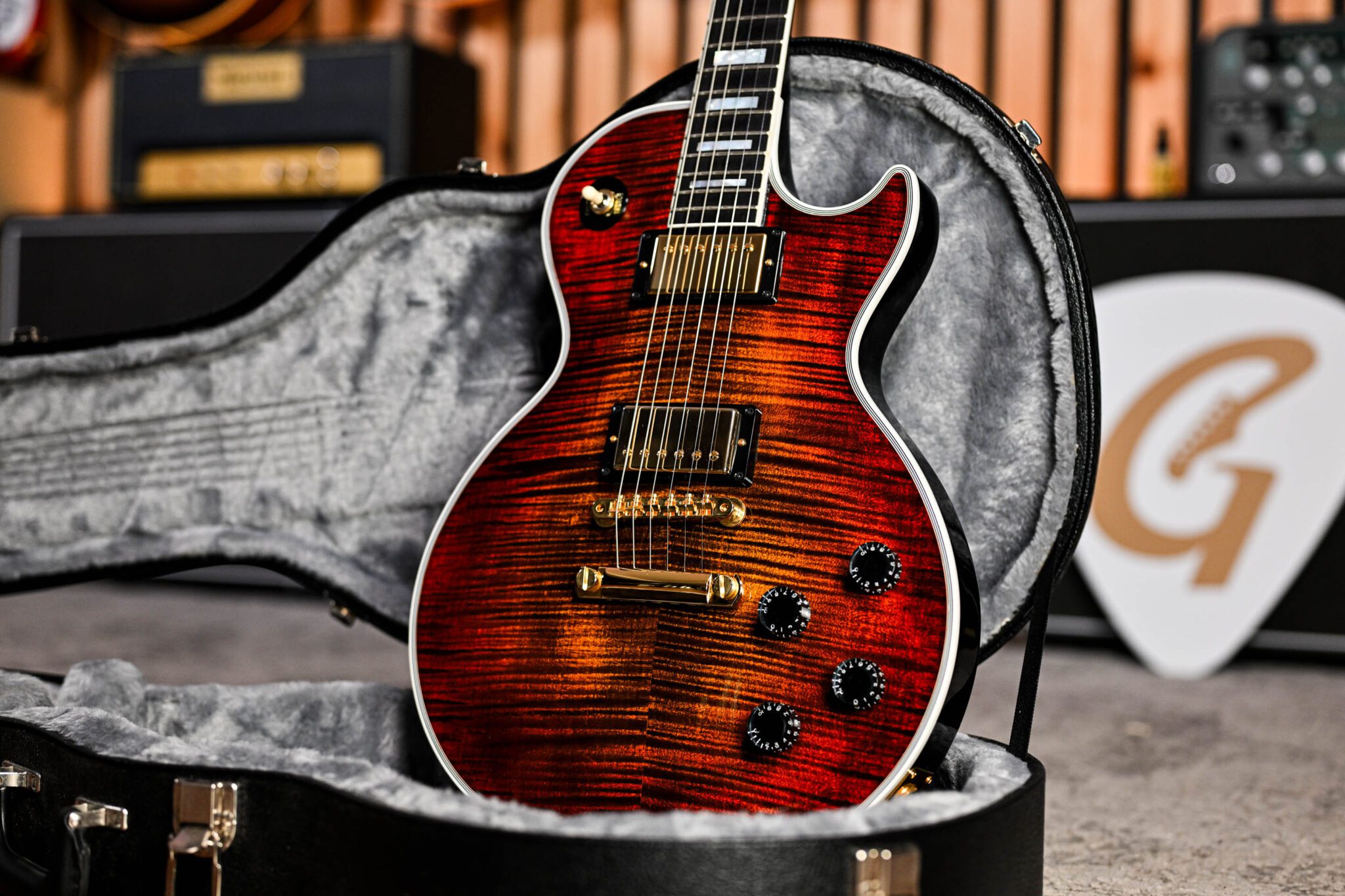 The Gibson Custom Shop is the pinnacle of craftsmanship, quality, and sound excellence. Each instrument celebrates Gibson’s legacy through accuracy, authenticity and attention to detail and this Les Paul Custom Axcess is no exception! The iconic Les Paul Custom has been re-imagined in this Axcess version, featuring the new Apex headstock for added strength, redesigned contours for added comfort and fingerboard access, and powerful coil-tapped humbuckers for sonic versatility and strength. This version features the classic Tune-O-Matic bridge and stop bar tailpiece with an eye-popping figured maple top, finished in the delicious Bengal Burst to bring out every nuance of the flame maple.