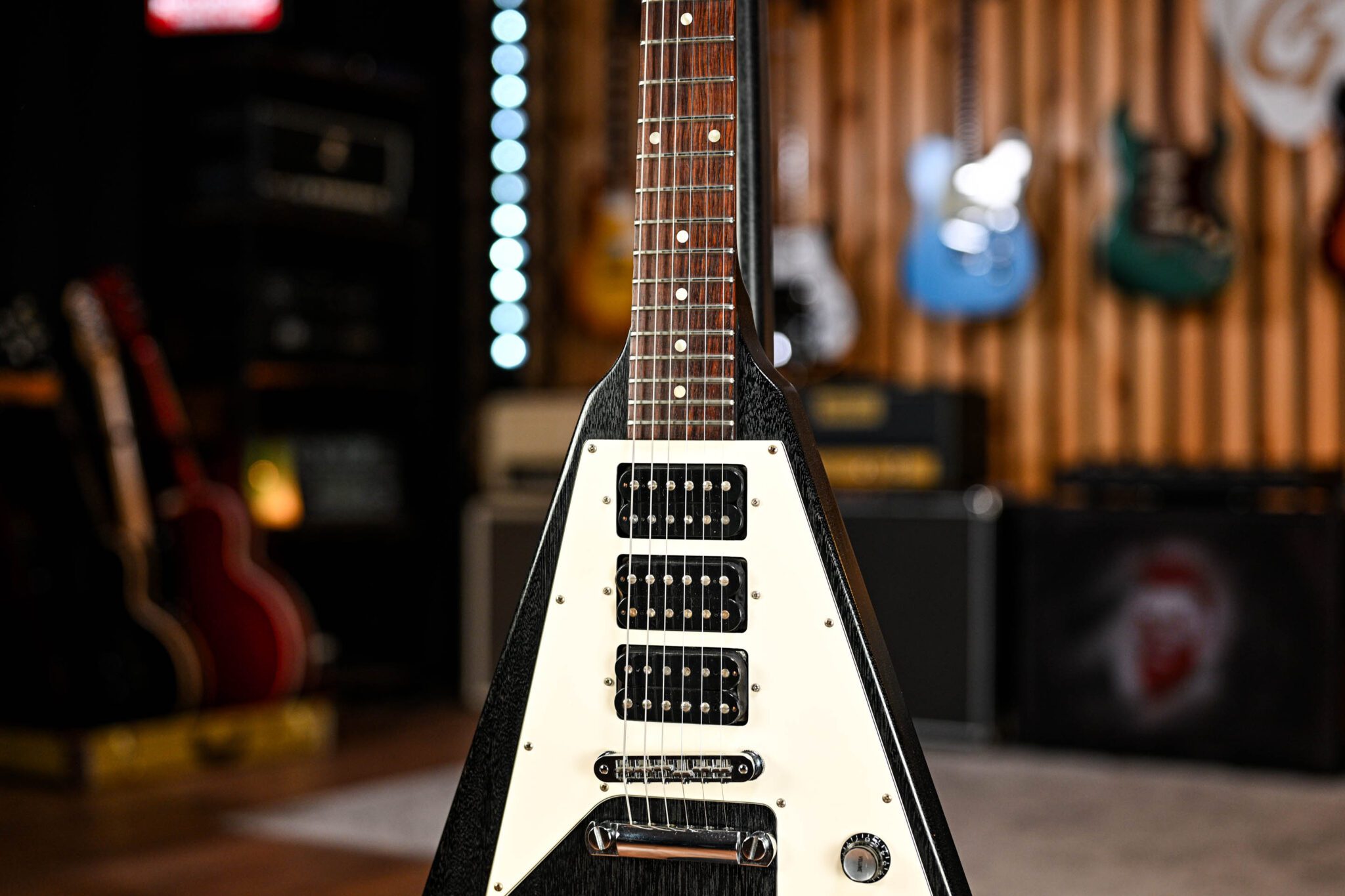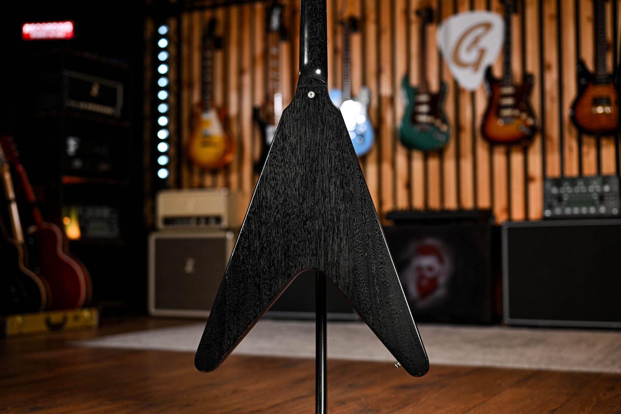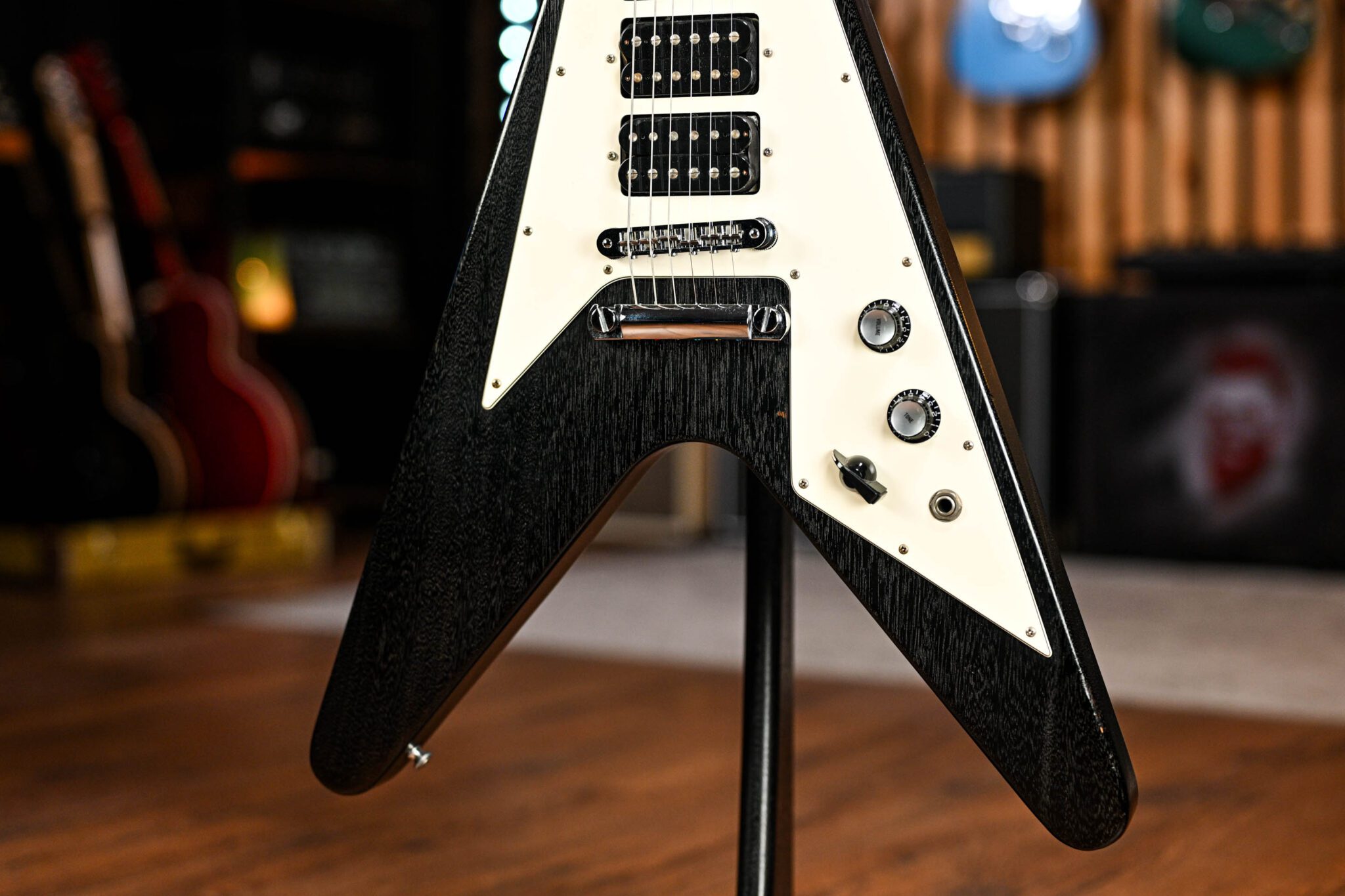 What we have here is a stunning guitar that embodies everything we love about the Flying V; 3 powerful humbucking pickups, fixed neck, nitrocellulose Worn Ebony finish, amazing fret access and of cause that pure rock shape! Set up and ready to go this is an amazing looking, sounding and playing guitar.