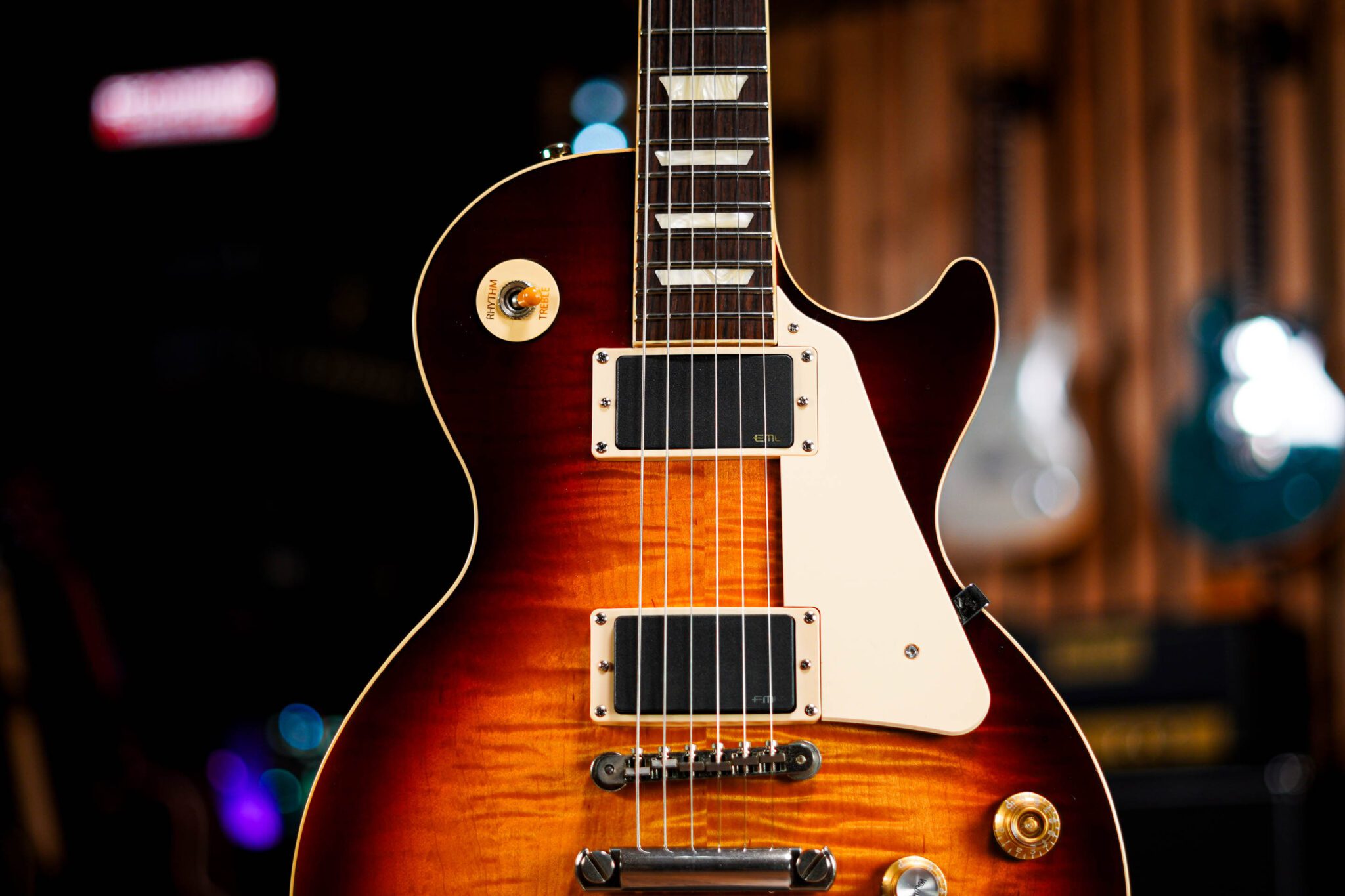 What we have here is the Standard 60s with a slightly slimmer neck from its 50s counterpart, paired with a set of huge-sounding EMG’s, making it the perfect guitar for any fan of rock tone with speed and comfort in mind. From there we have the all-important Les Paul features, a mahogany body, mahogany neck with a rosewood board. Presented with a stunning maple top, familiar controls, this is the definition of a fast playing, huge sounding legendary Les Paul!
