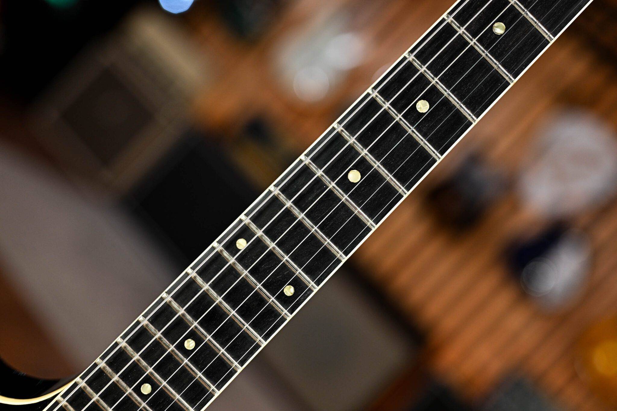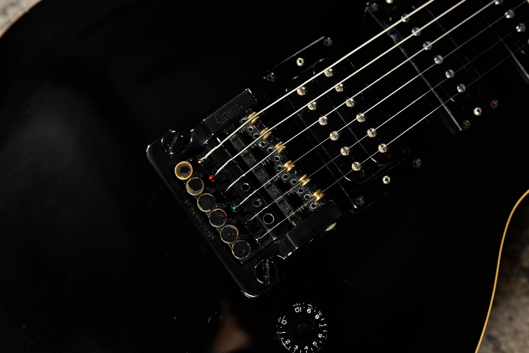 If owning a rare 40-year-old Gibson wasn’t enough for you, it’s packed with other little hidden surprises – the bridge is loaded with a very rarely seen and collectable ‘double cable’ Dirty Fingers humbucker providing huge tones, splittable with the tone pot. On top of that, you have a rare Gibson-branded Kahler stud mount trem system, which featured on only a few models in the mid 80’s before switching to Kahler branding. Because the Kahler is stud-mounted, if you want to take it off and put a standard tune-o-matic bridge on with no modding, it’s as easy as undoing 4 screws and putting a tune-o-matic in its place! Add to this the 2 Gibson single coils selectable with individual on/off switches, you’ve got an incredibly versatile guitar. It’s been gigged hard and we can see and hear why – comfort, looks and tone!
