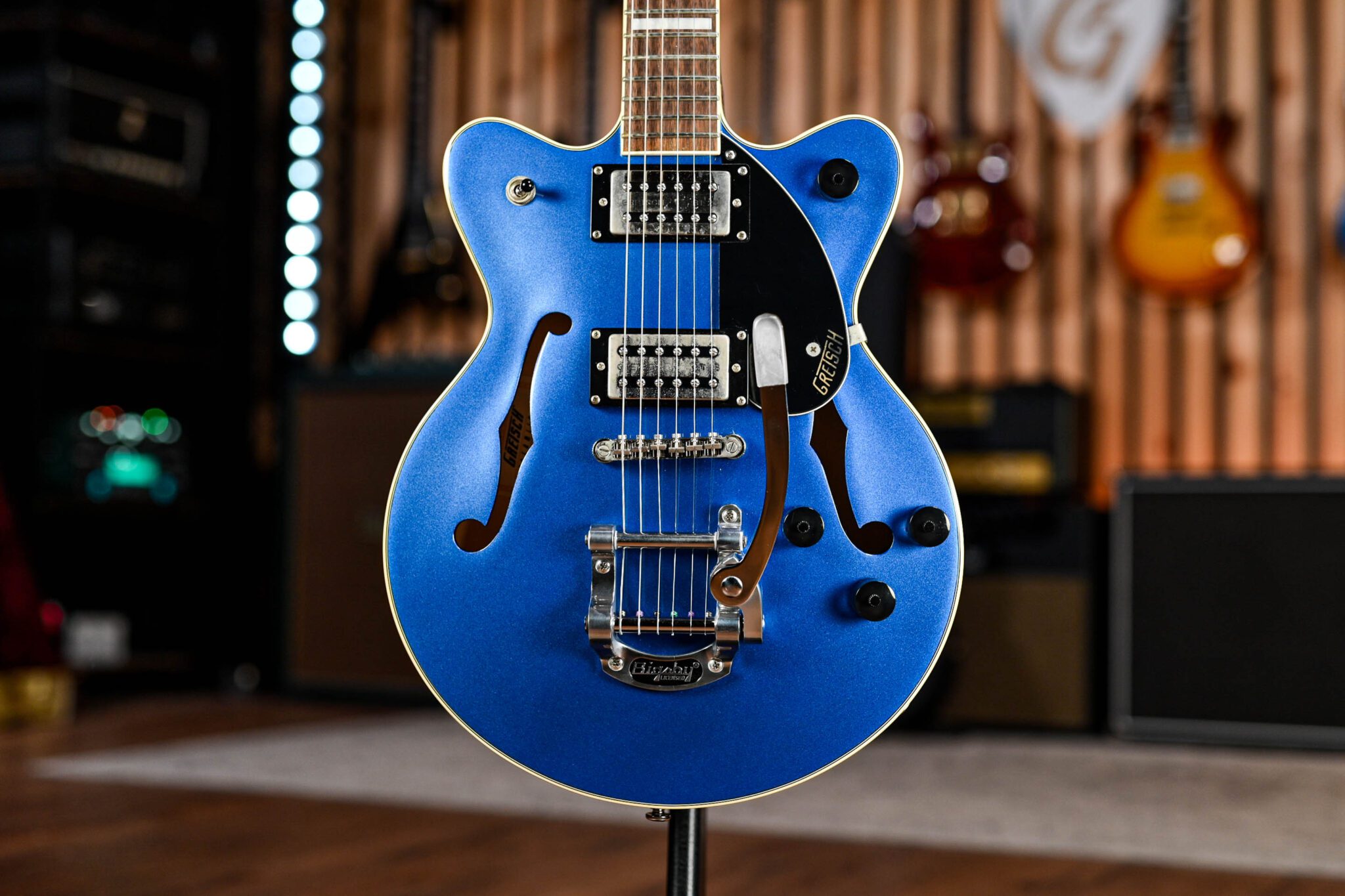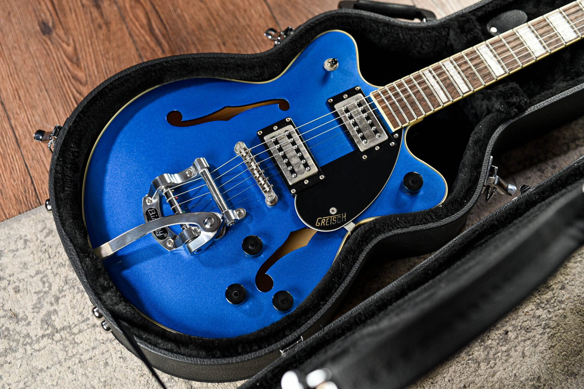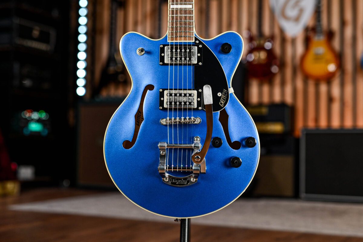 The G2655T Streamliner Center Block Jr. Double-Cut with Bigsby bursts into the modern era with powerful sound and style in a smaller package. The sleek G2655T is designed for the guitarist who demands more than the mundane from an instrument—more performance, more style and most importantly, more volume—while retaining everything you expect from a Gretsch.