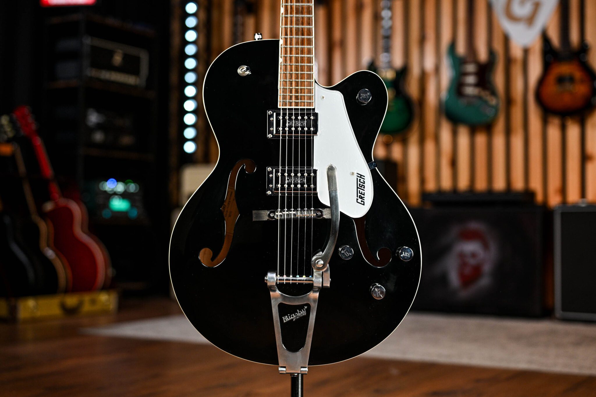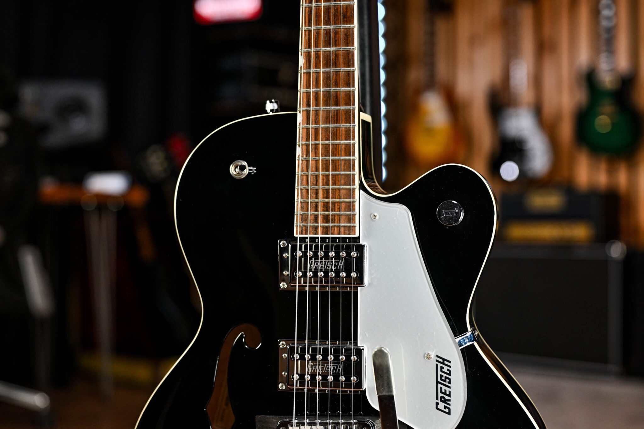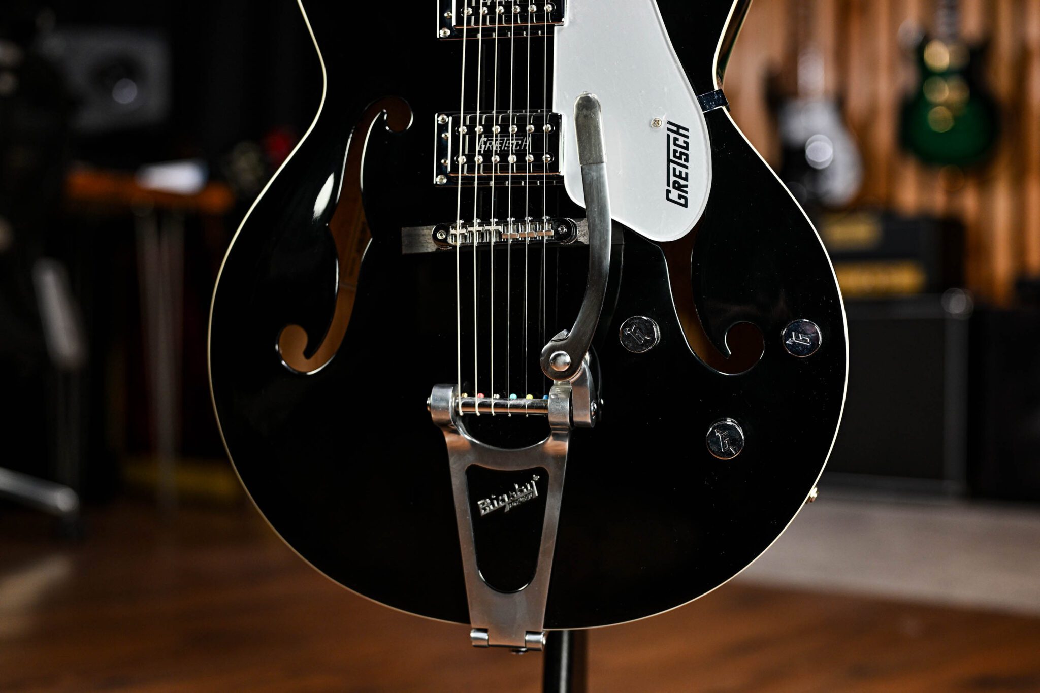 Boasting excellent Gretsch pickups, an Adjusto-Matic bridge, and chrome-plated die cast tuners, alongside a Bigsby B60 tailpiece that delivers stunning vibrato. With 3-way pickup selecting, and four controls – neck pickup volume, bridge pickup volume, master tone, and volume – you will be conjuring the tone you’re after in no time!