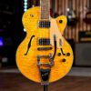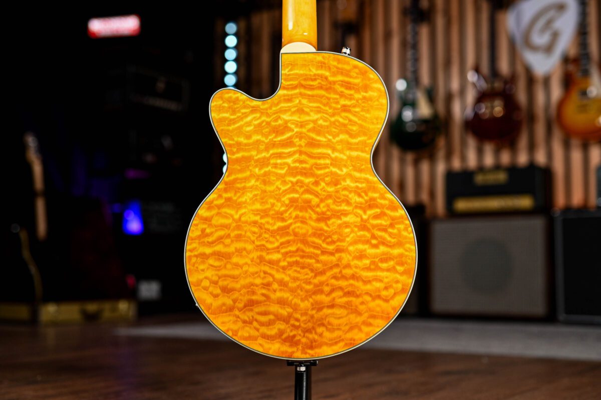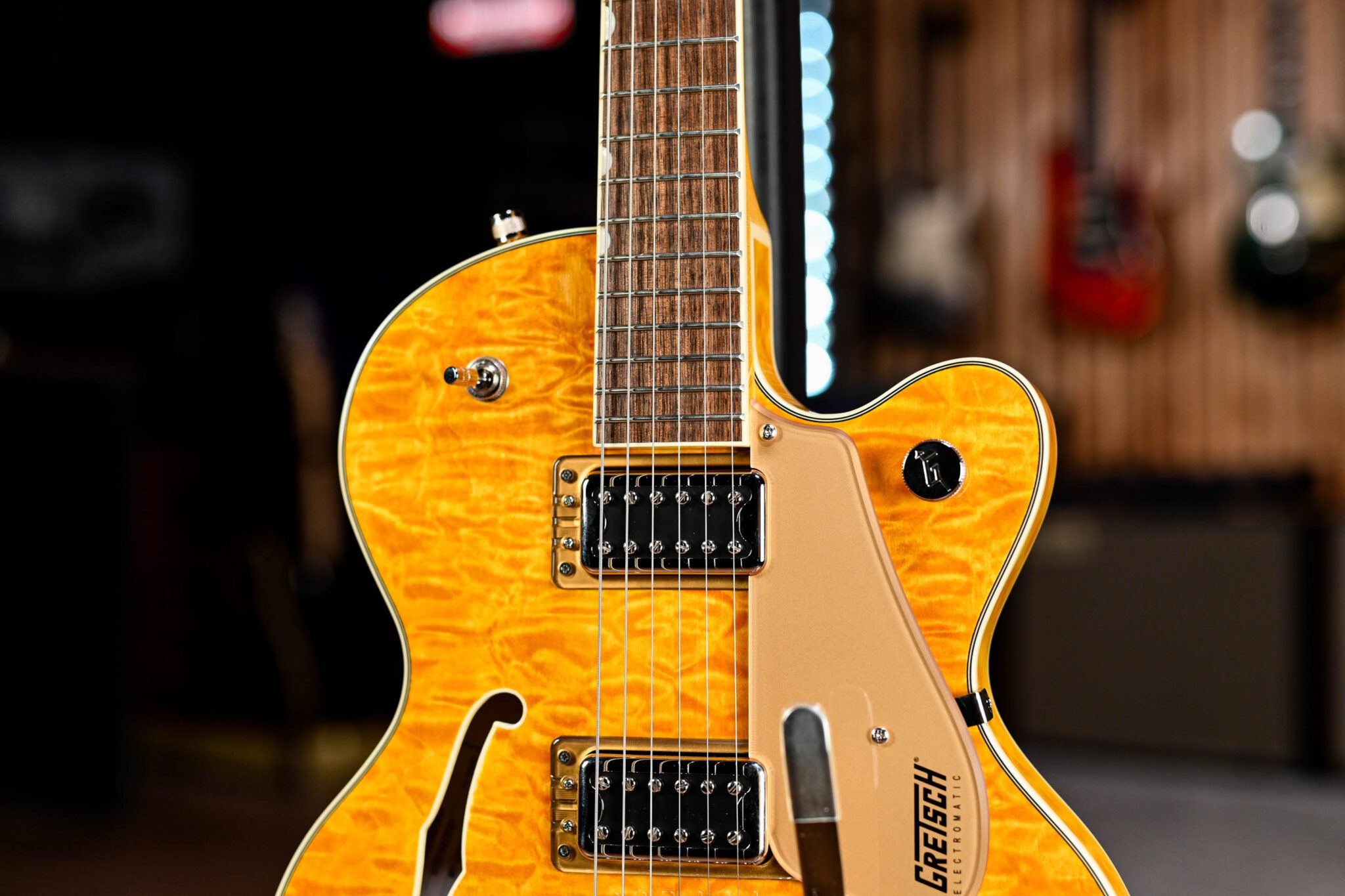 The core of the Gretsch G5655TQM electric guitar is its Maple construction, which delivers a distinctively bright, crisp and clear character with impressive sustain. The quilted Maple top imparts a luxurious and sophisticated look that’s complimented by the classic Gretsch styling.