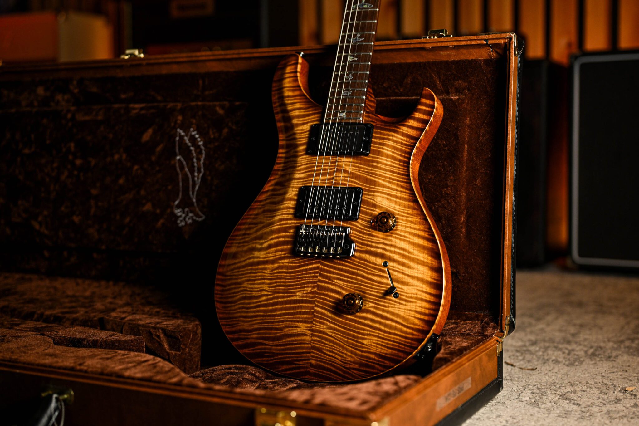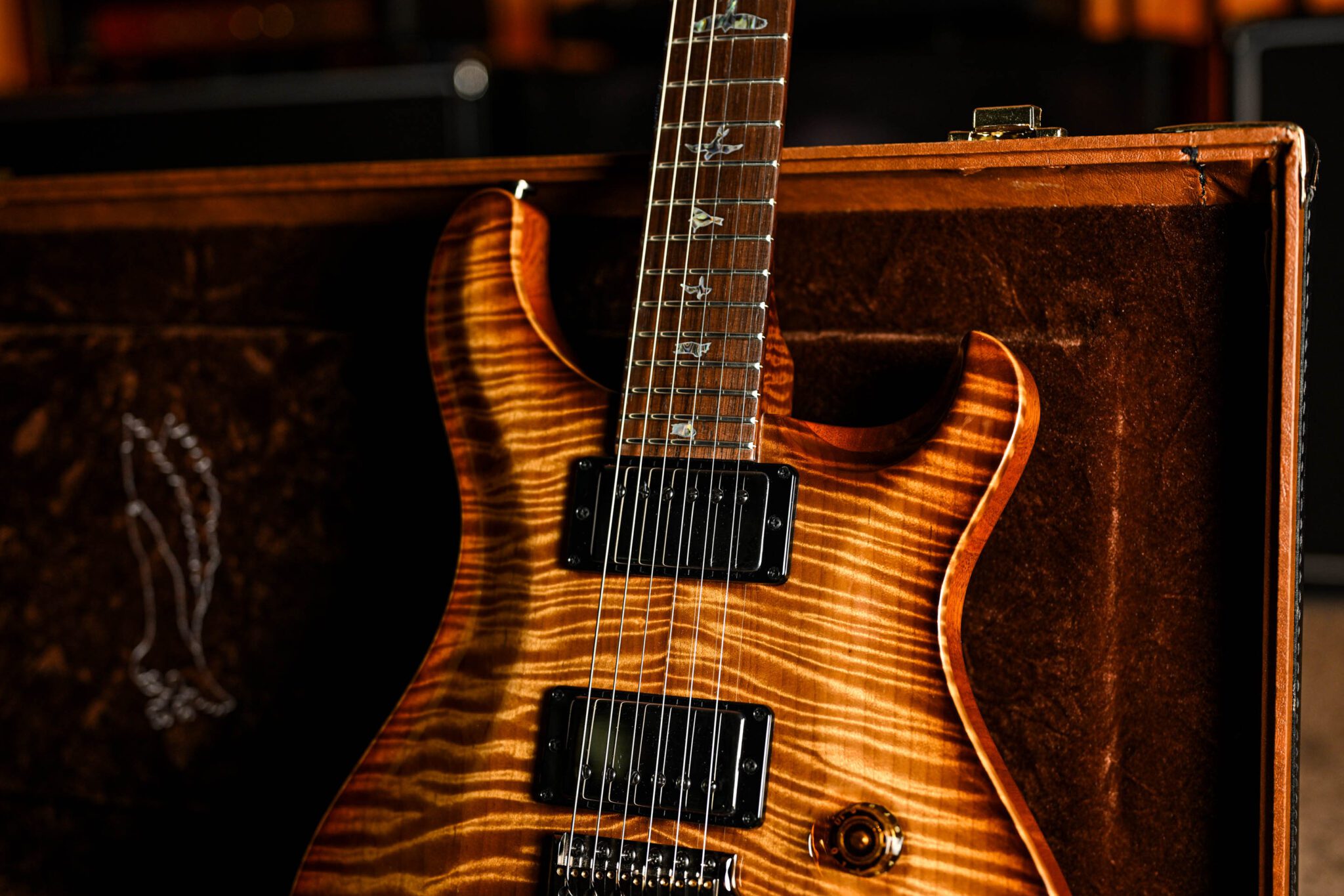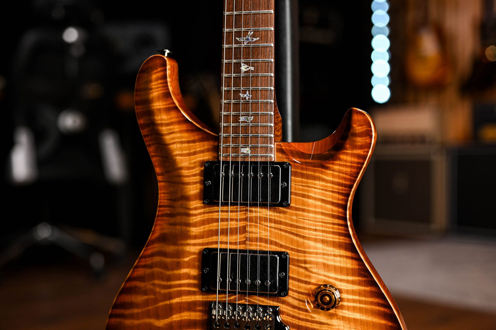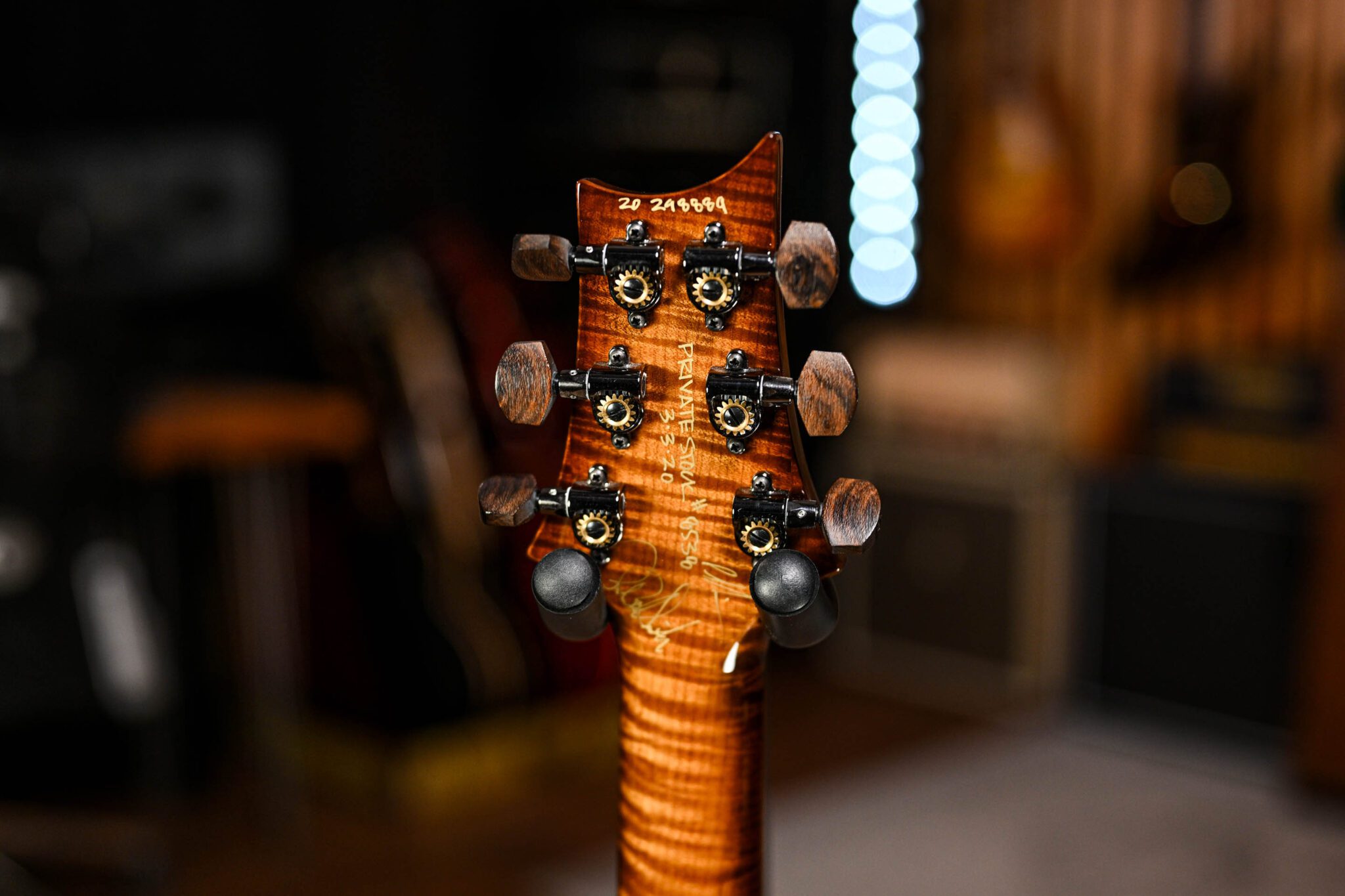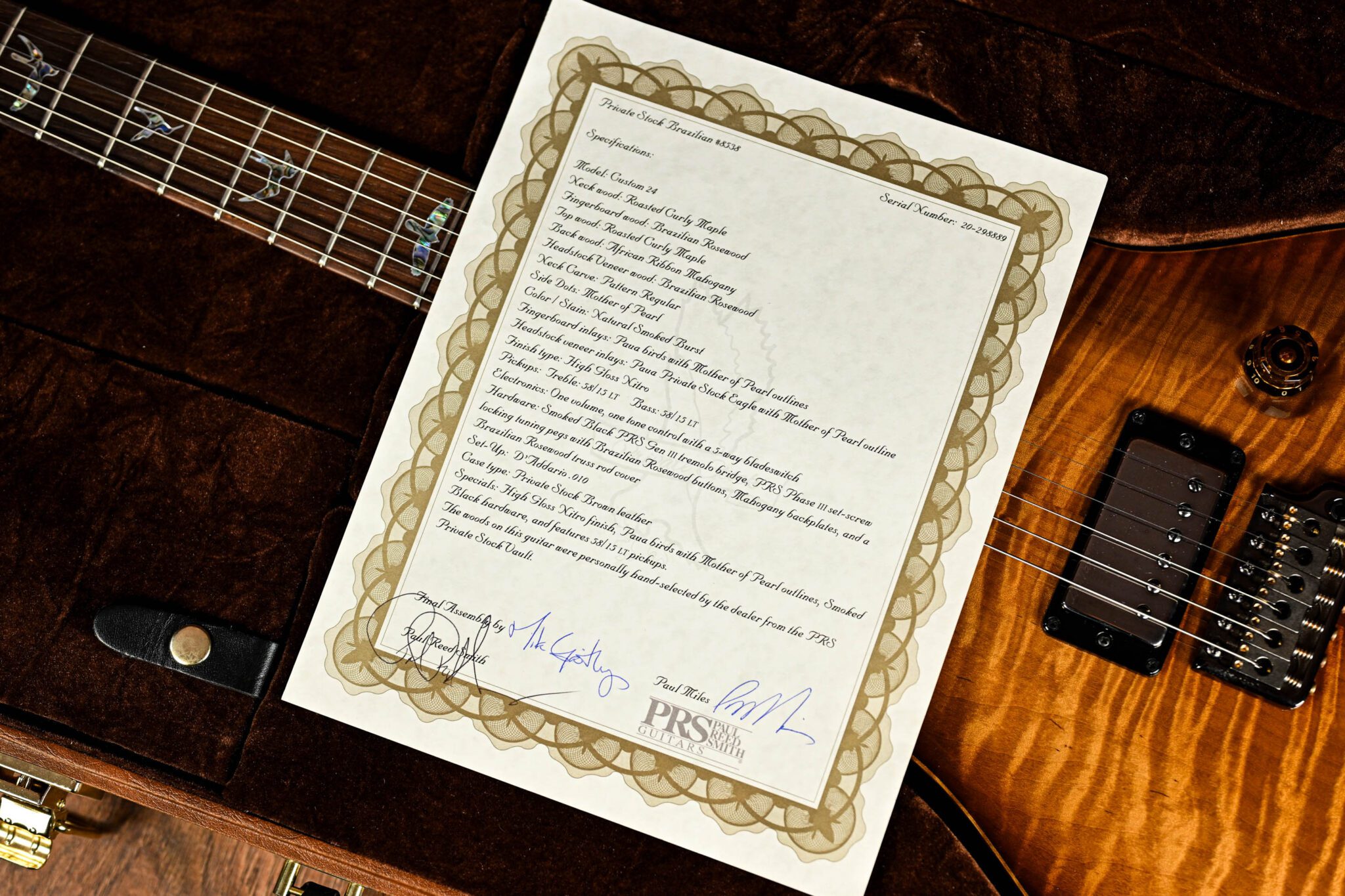 To fully appreciate the dream specs and outstanding craftsmanship of this instrument it really has to be seen and played to be believed but to give you an idea we are looking at; a Brazilian rosewood fingerboard with Paua bird inlays with mother of pearl outlines, roasted curly maple neck, quilted maple top, African ribbon mahogany body covered in a pristine nitrocellulose finish, signed off by Paul Reed Smith himself before leaving his workshop.