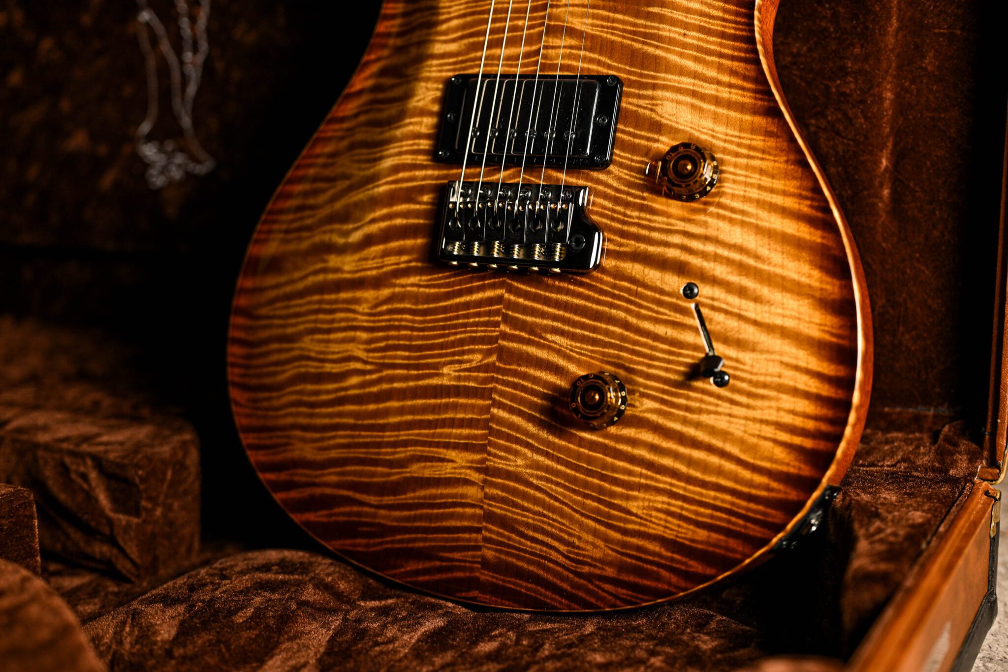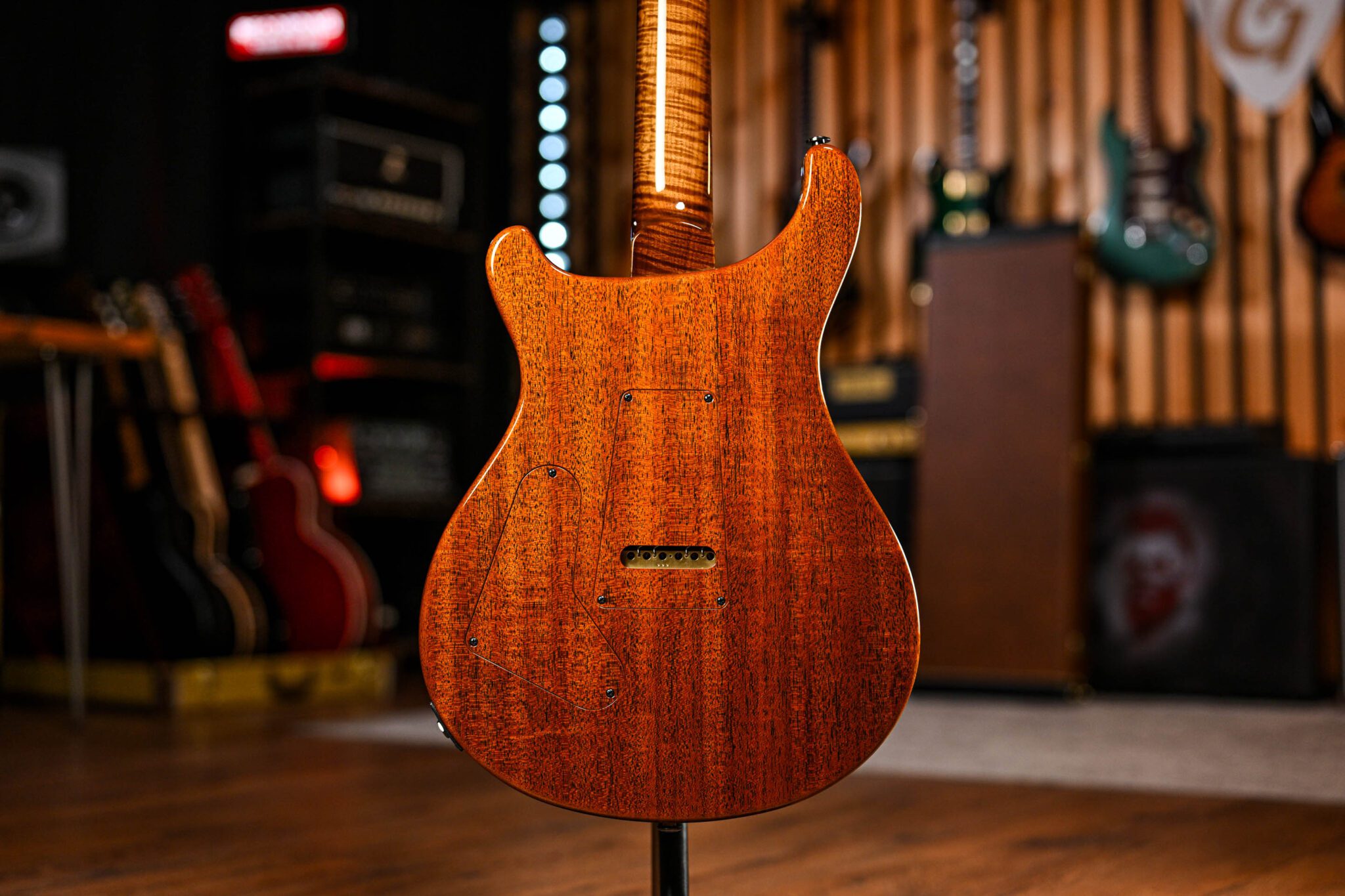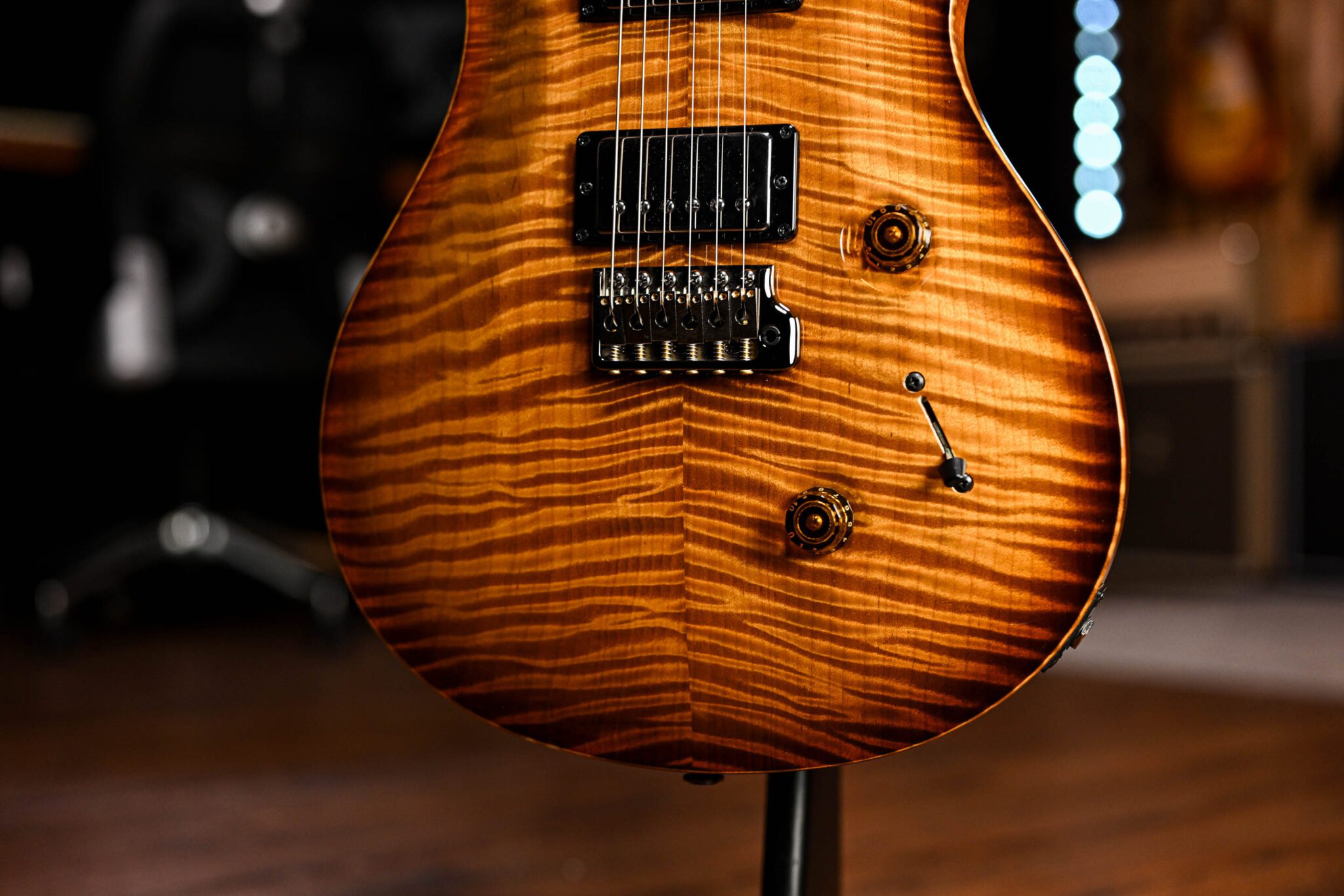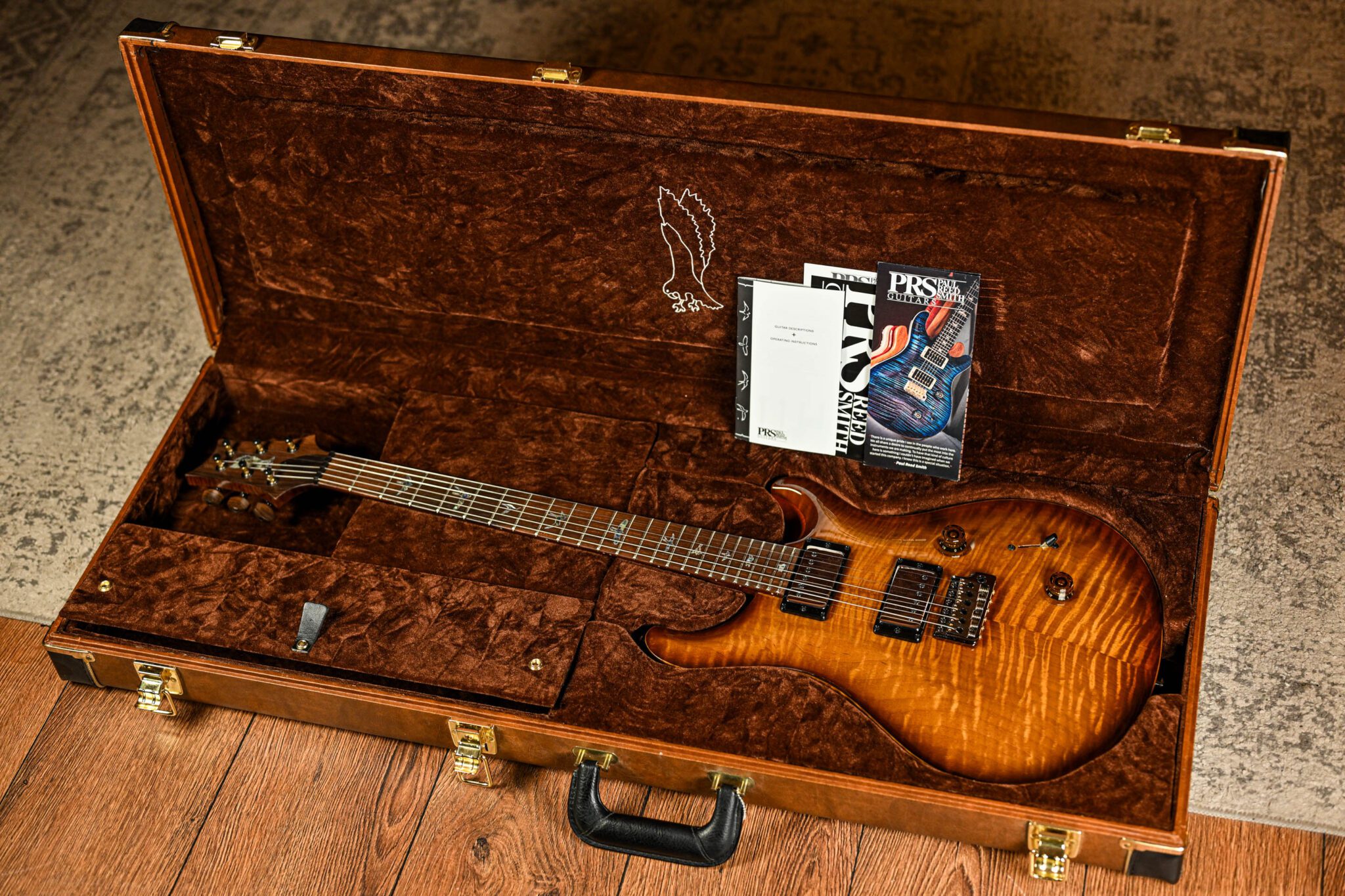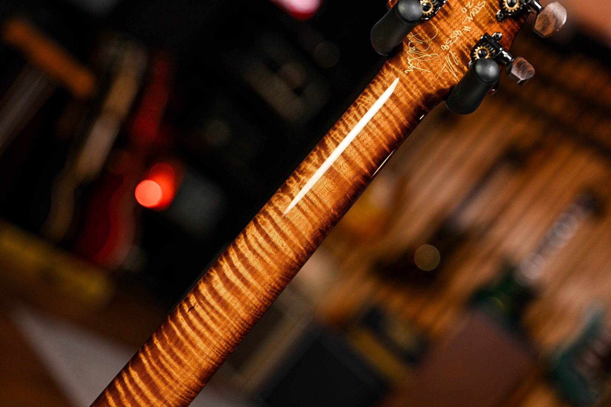 To fully appreciate the dream specs and outstanding craftsmanship of this instrument it really has to be seen and played to be believed but to give you an idea we are looking at; a Brazilian rosewood fingerboard with Paua bird inlays with mother of pearl outlines, roasted curly maple neck, quilted maple top, African ribbon mahogany body covered in a pristine nitrocellulose finish, signed off by Paul Reed Smith himself before leaving his workshop.