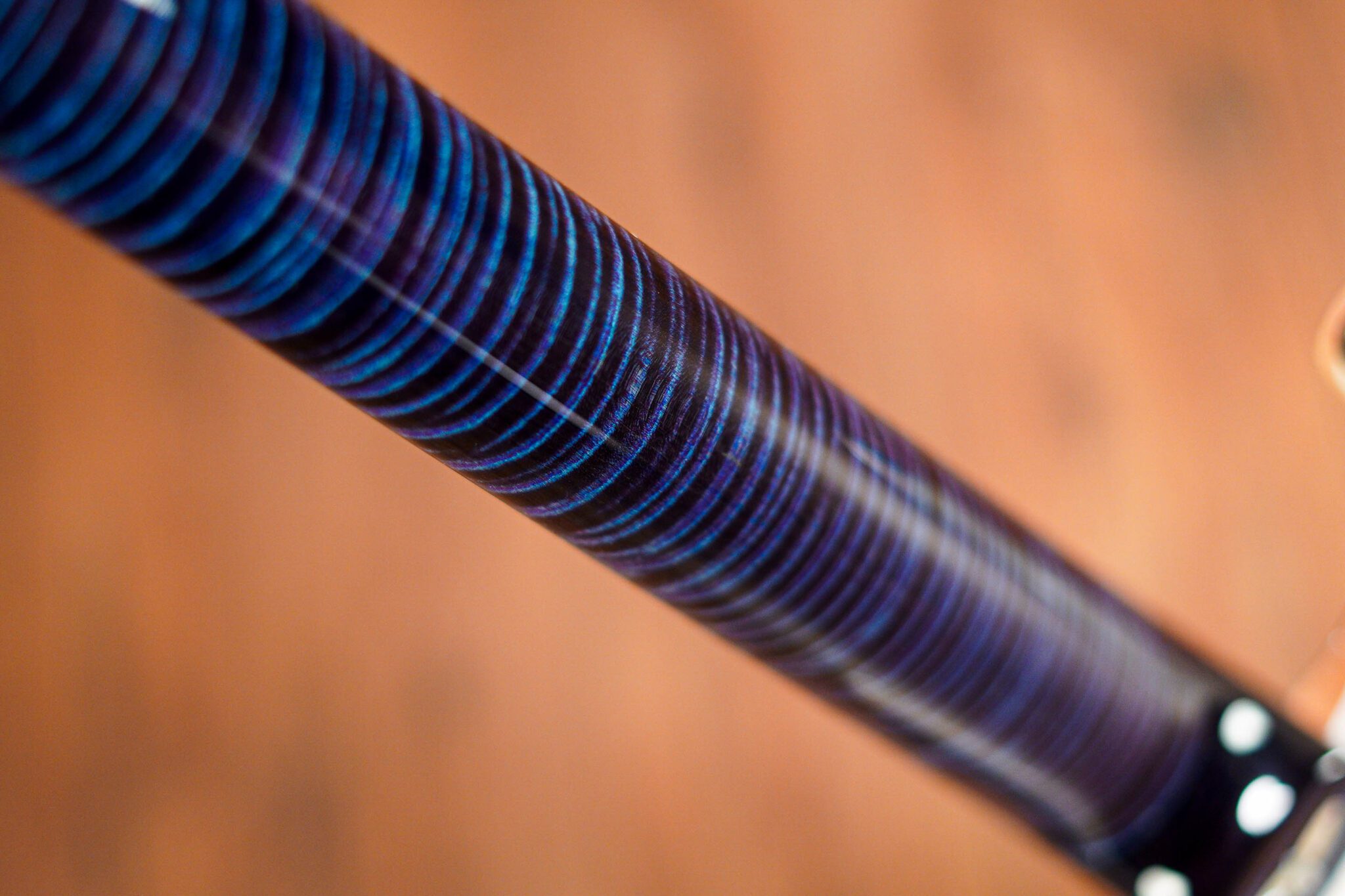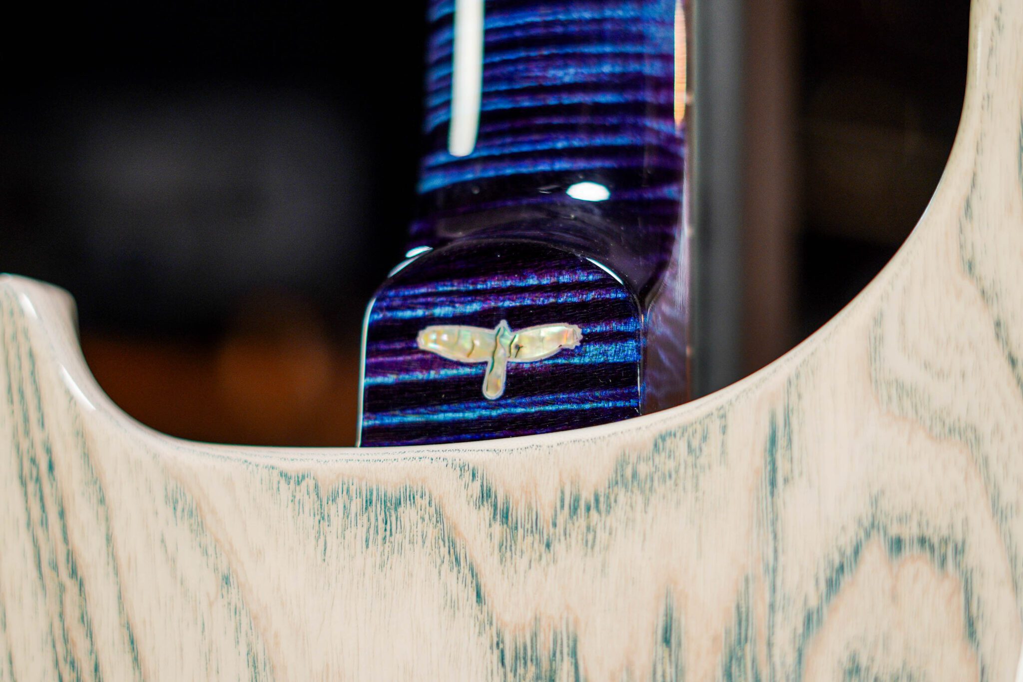 This unique, stunning and rare guitar literally takes your breath away! From the stunning swamp ash body, highly figured curly maple top, ziricote fretboard with curly maple neck through to the abalone bird inlays with mother of pearl outlines!
